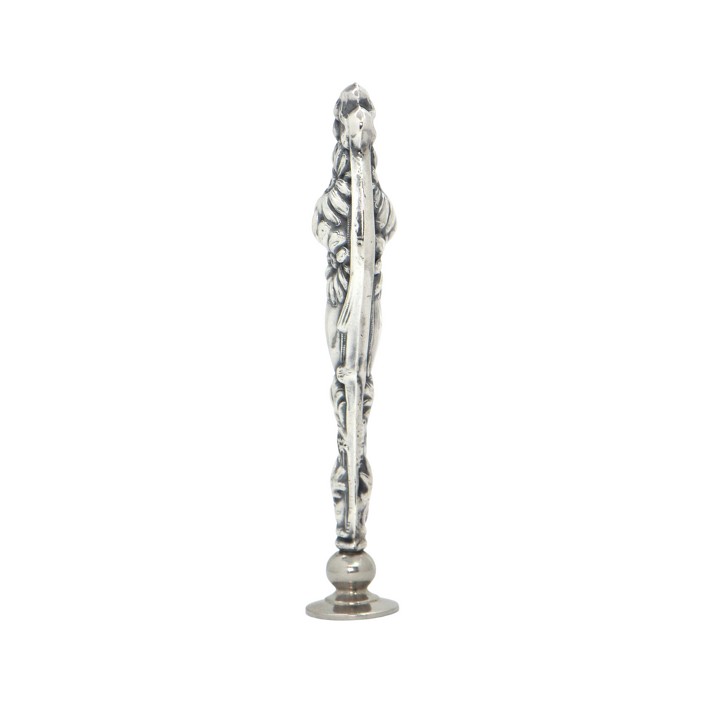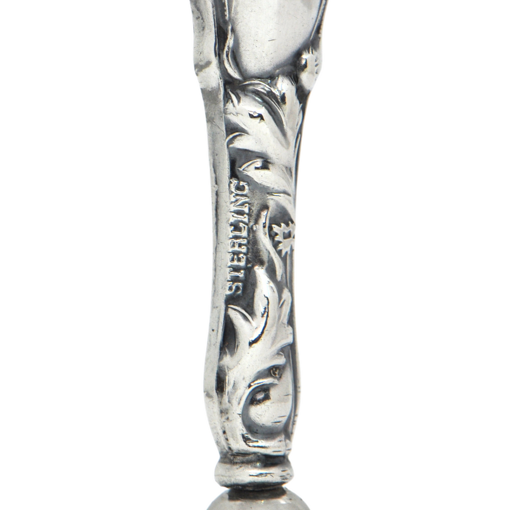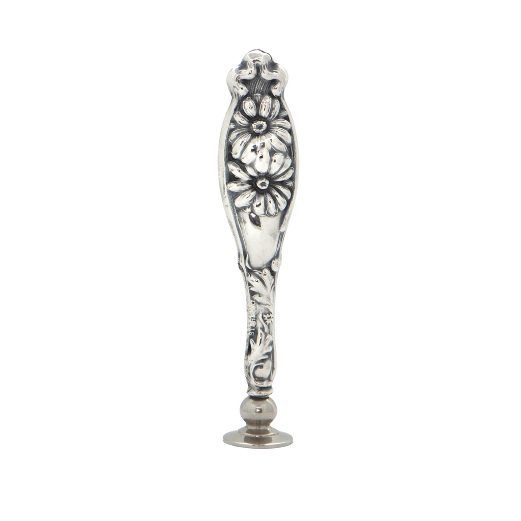 Antique hollow sterling silver wax seal splendidly decorated in the repoussé technique featuring a scroll and floral motif. The round matrix (stamp) is empty perfect for your initials or family crest.
