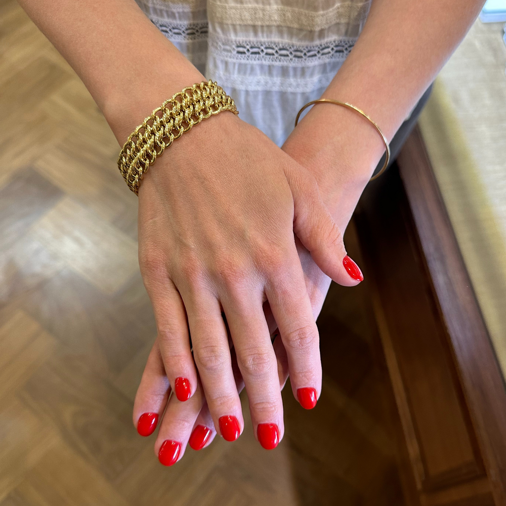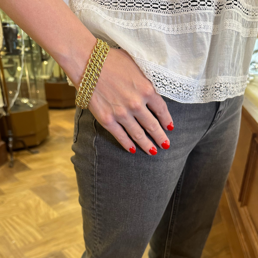 Estate solid 18k yellow gold fancy link bracelet by, mid-century Montreal jewelry designer Lucas. This heavy wrist adornment would make a fantastic charm bracelet!