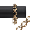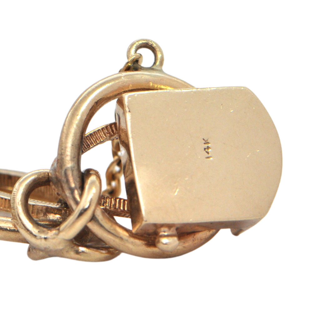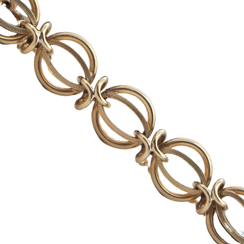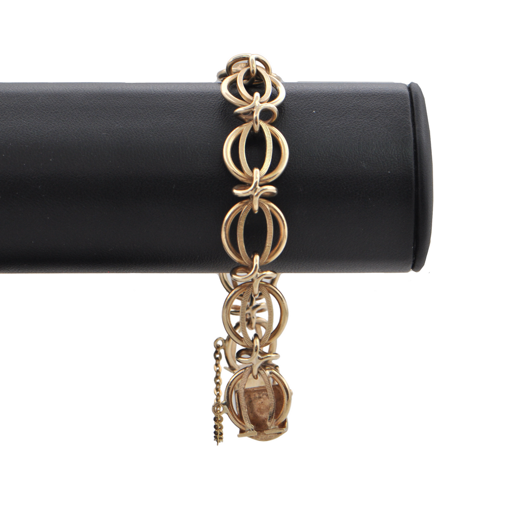 Elegant vintage 14k yellow gold fancy round and oval link bracelet featuring both a high polish and textured finish. Bracelet attaches with a push clasp and has a figure eight safety lock and safety chain.