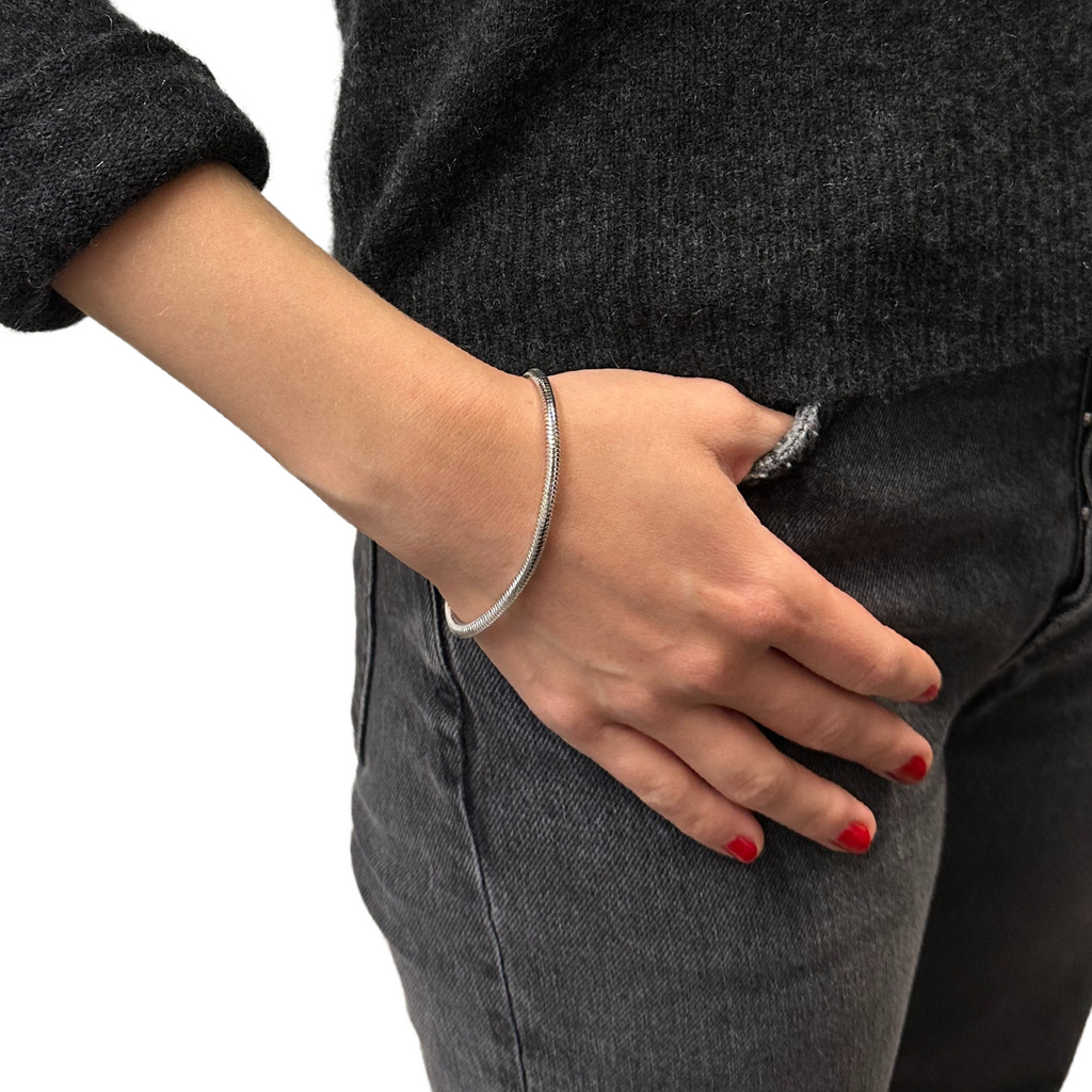 Attractive 14k white gold snake link bracelet. Attaches with tube lock and features a safety eight clasp.