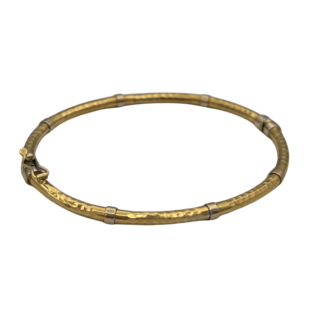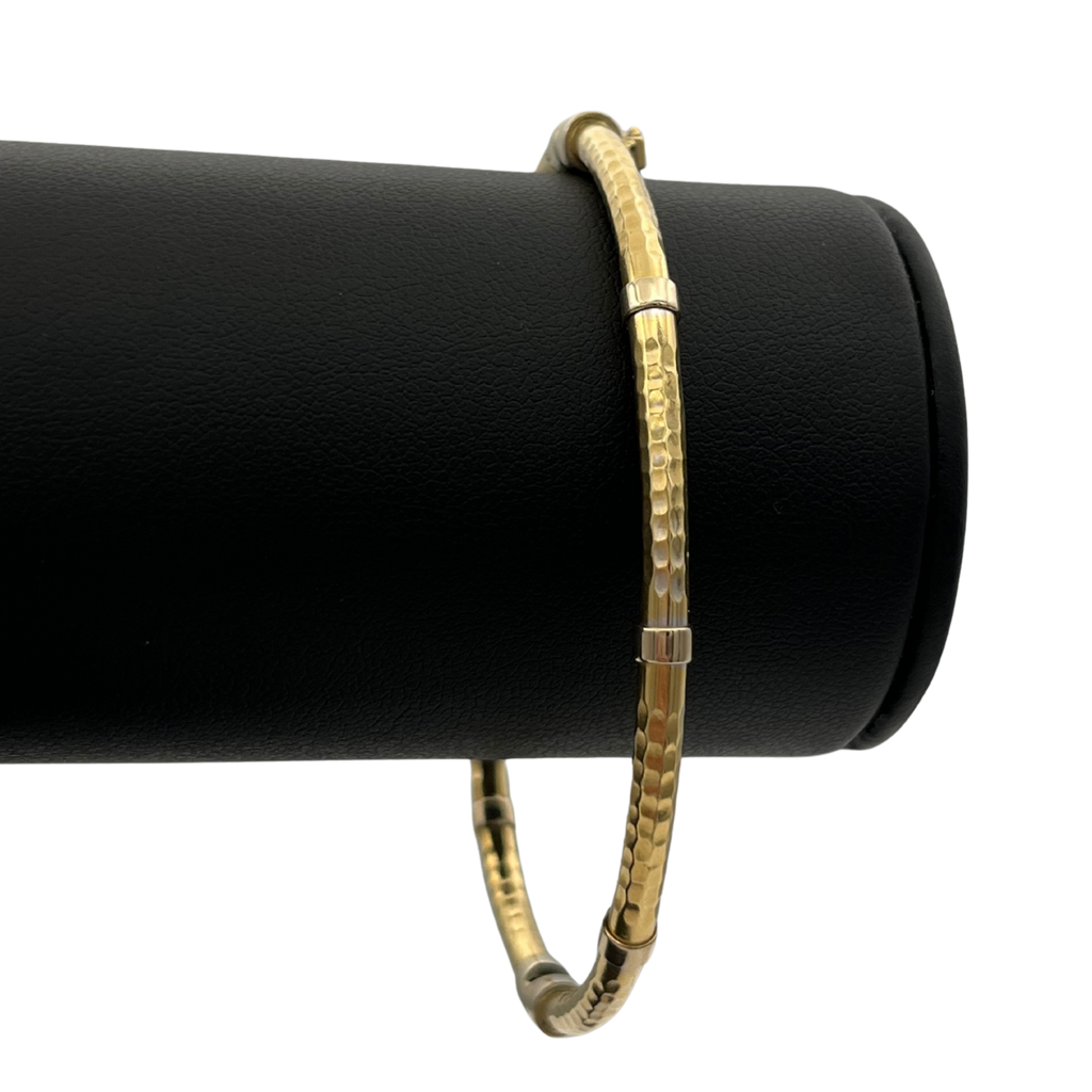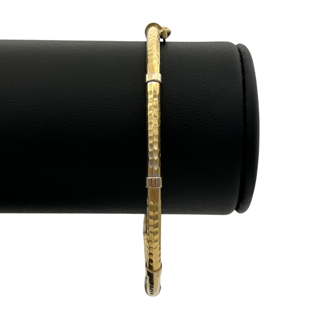 Vintage hollow 18k yellow and white gold hinged oval bangle bracelet with hammered finish and figure eight safety clasp.