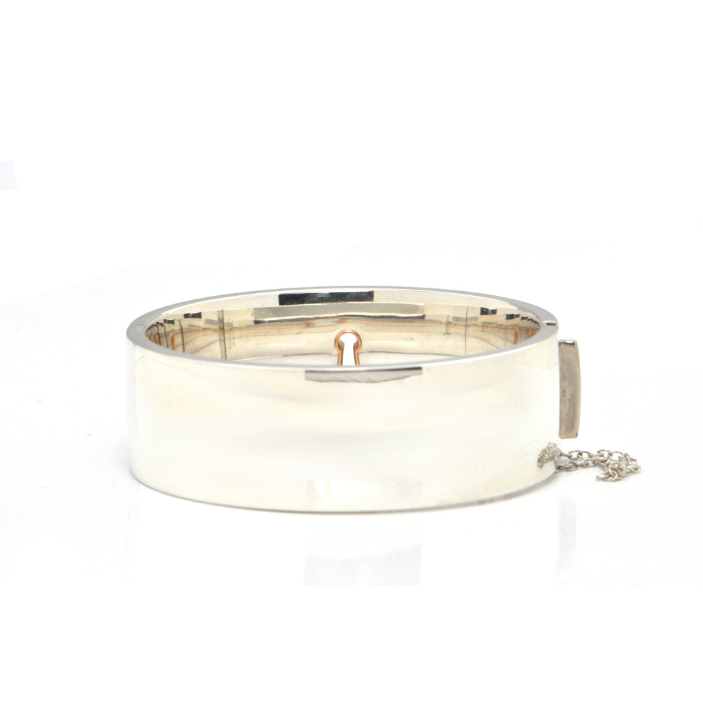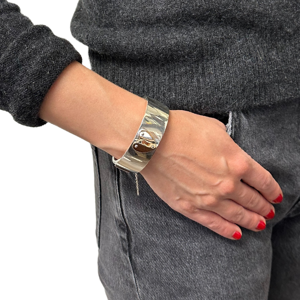 Lovely vintage Tiffany & Co. large hinged cuff in sterling silver with one 18k rose gold heart. Bracelet has a safety chain for added security.