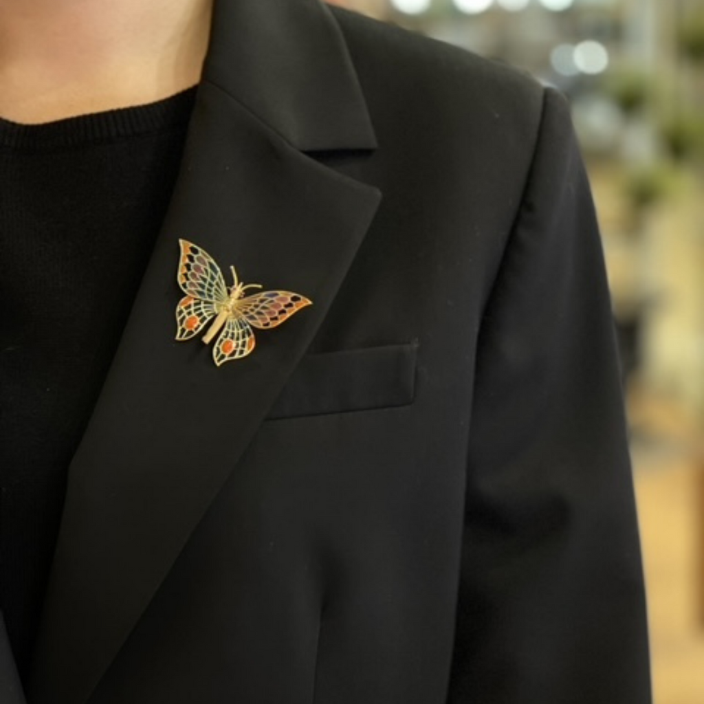 Absolutely charming 18k yellow gold butterfly brooch with textured body and ruby eyes. Wings are ornamented in bright shades of red, blues, pink, coral, and purple done in the plique-à-jour (translucent enamel) technique. The articulated moving wings are so finely made that they are able to stand in place on their own. Our hearts fluttered when this special specimen flew into the store!