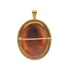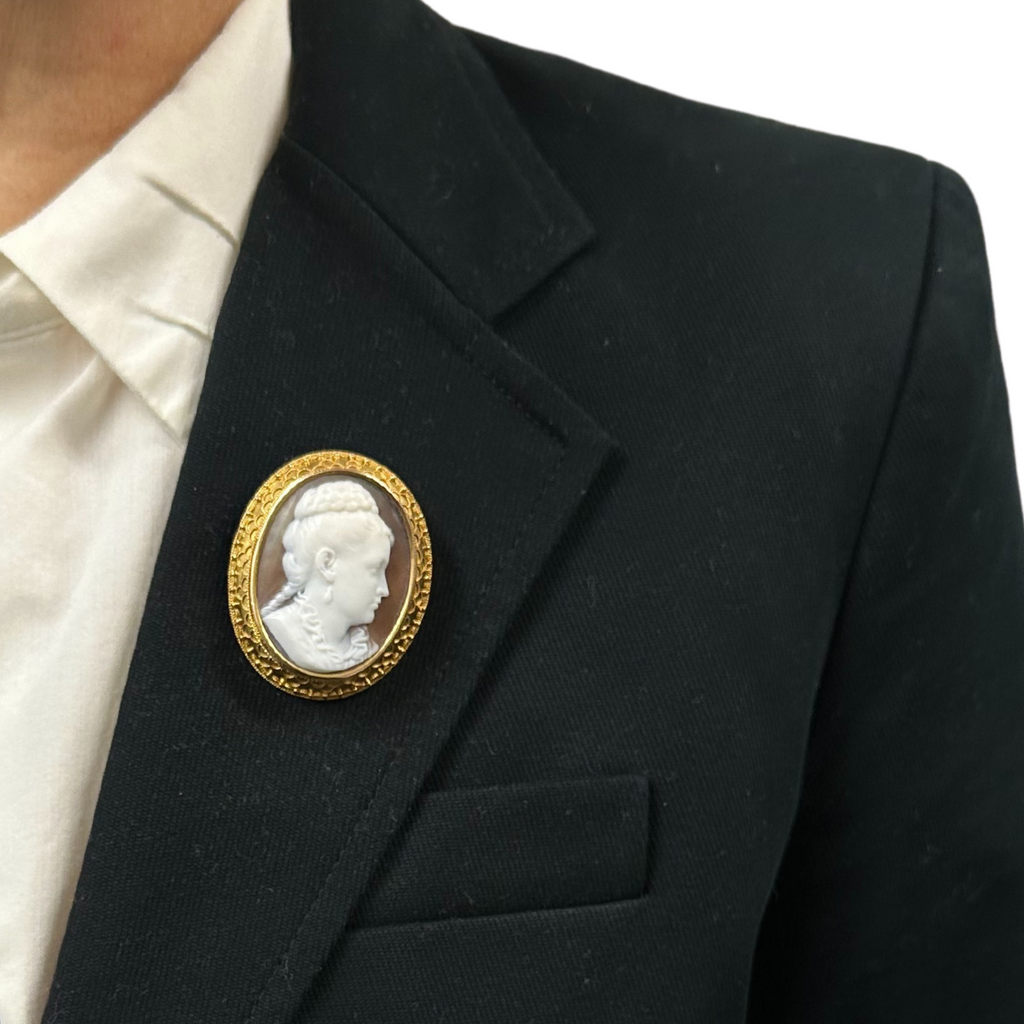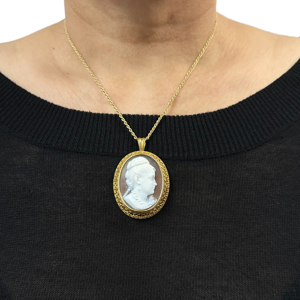 Elegantly detailed hand-carved cameo of the profile of a Victorian woman with beautifully coiffed hair, and a dangling earring. She is set in a 14k yellow gold frame featuring granulation and wire work design elements. This cameo can be either worn as a pendant or brooch.
