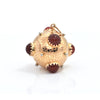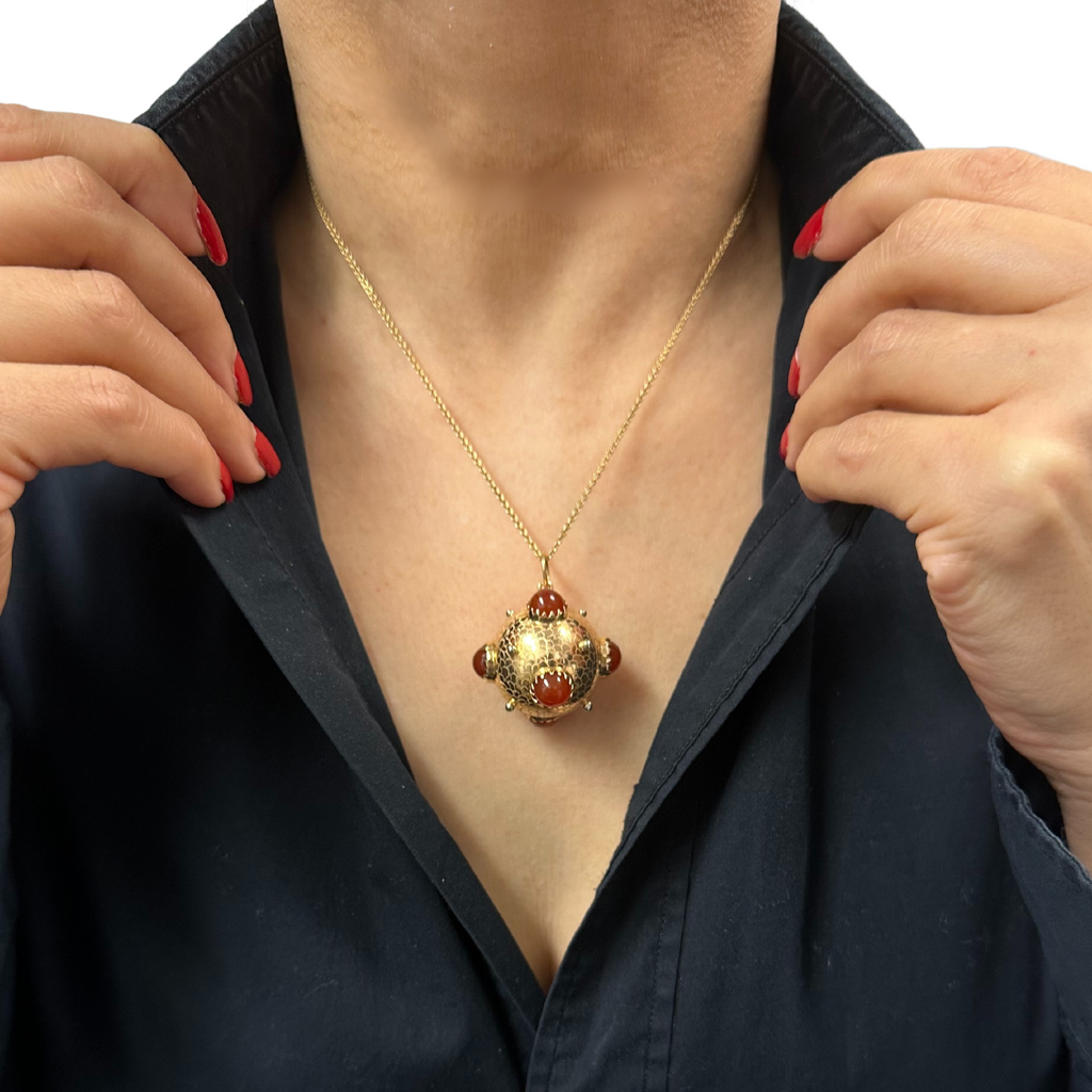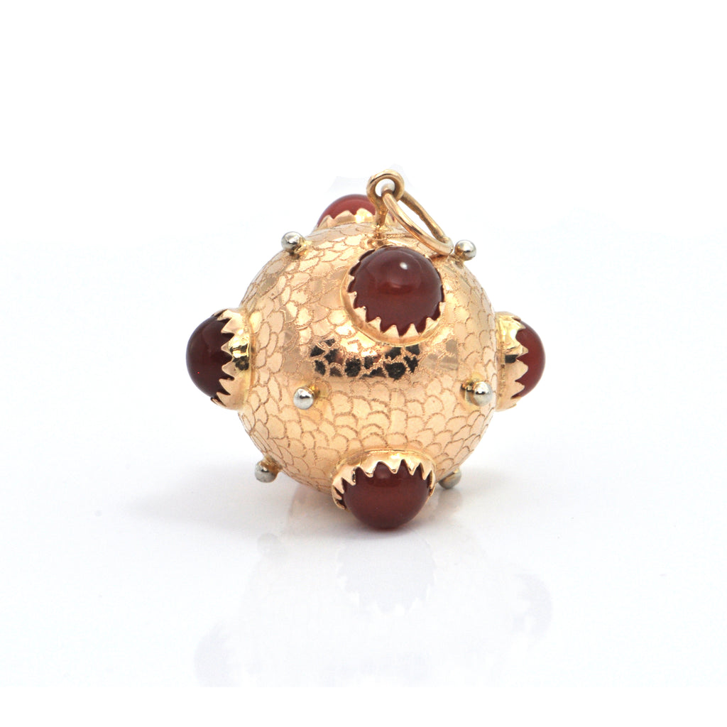 Large gold orb with bezel set brick red colored glass cabochons. Orb is delicately engraved to mimic fish scales.