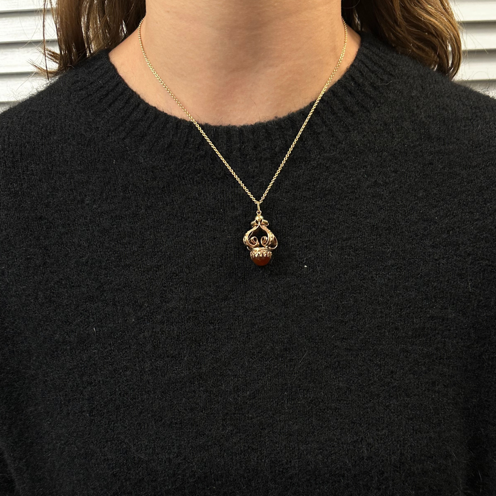 Delightful mid-century 10k rose gold fob charm/pendant beautifully done in the Etruscan revival style which saw a resurgence in the 1950's. Bottom of charm has a oval cabochon cut carnelian beautifully set in a ornate crown setting.