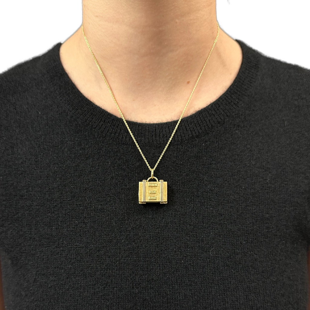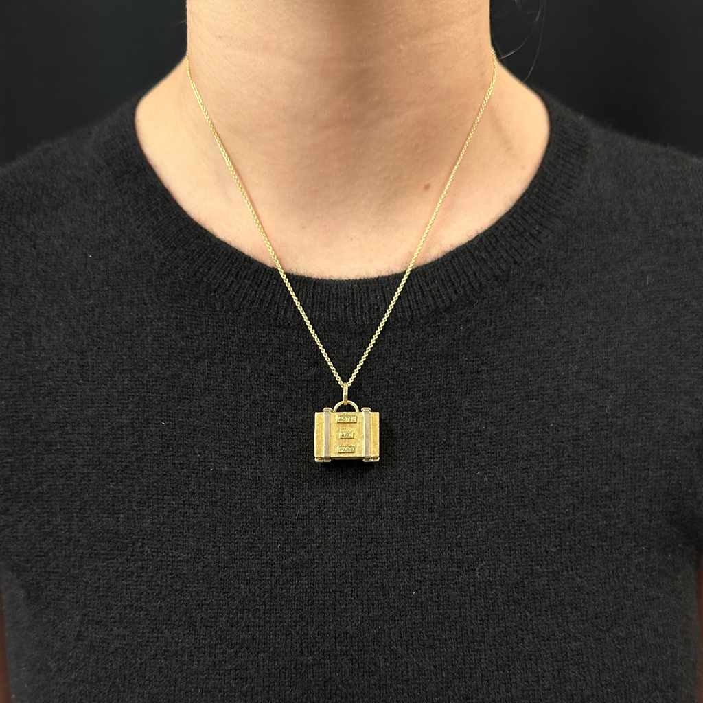 Pack your (very small) bag, we're going to Paris! Charming 14k two-toned suitcase charm that opens to reveal a bezel set blue glass stone and a lovely monogram. Clearly 'L.L.N' enjoyed their trip in the summer of '78.
