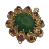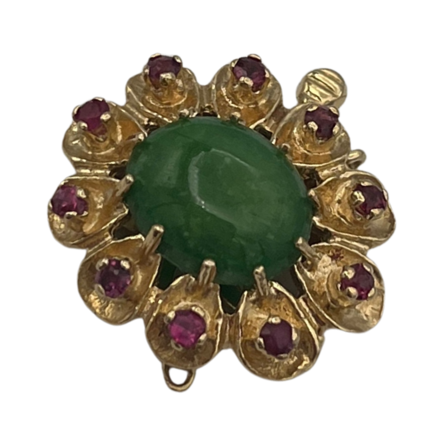 Vintage retro flower-shaped two-strand push clasp centered with a cabochon cut jadeite jade stone, and rubies on each of the petals. The clasp has one figure-eight safety lock.