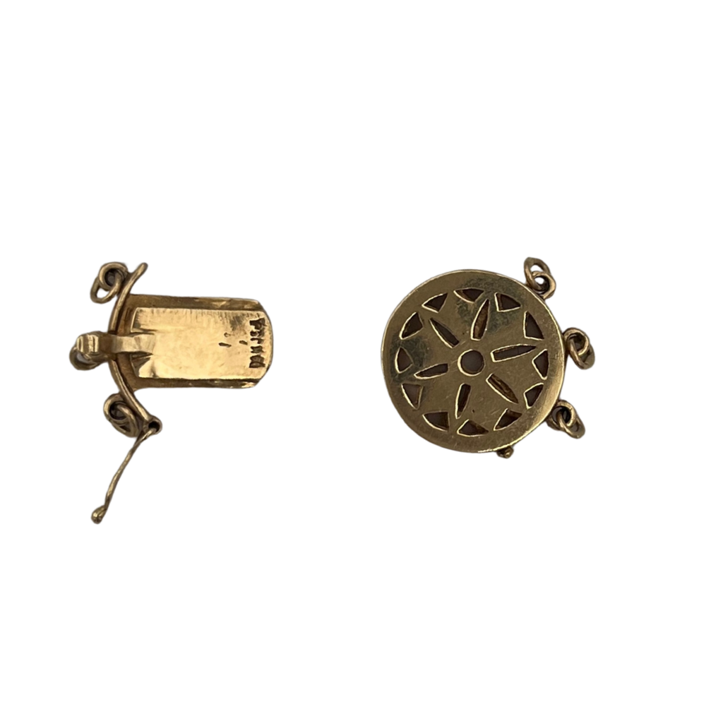 Elegant vintage 14k yellow gold round three-strand push clasp with a figure eight safety lock. Clasp features open work in floral-esq design. This lovely clasp would be perfect for a personal project.
