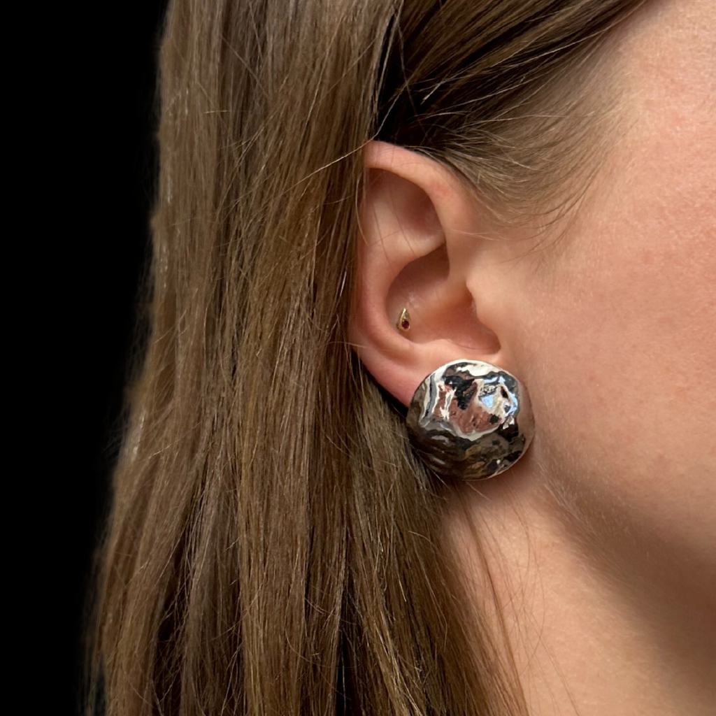 Pair of 18k white gold large round earrings featuring a hammered finish. Attaches with post and butterfly clasp. Custom-made for Daisy Exclusive by, Monica Savage.