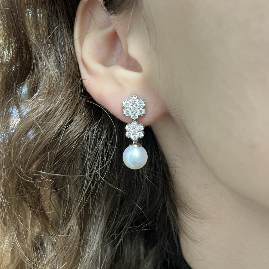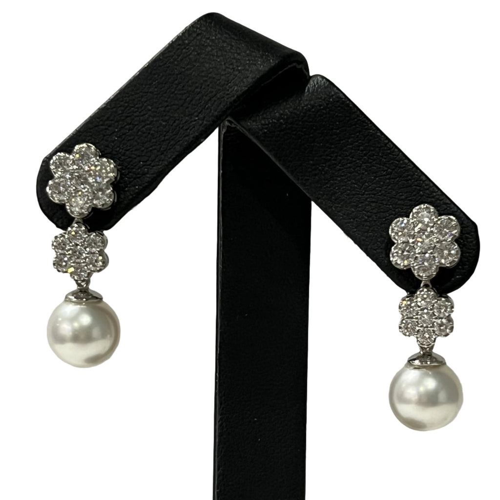 Absolutely stunning pair of Daisy Exclusive designed 18k white gold double diamond flower and South Sea pearl drop earrings. Whether its for a special occasion or just to wear with jeans these are the perfect earrings that go with anything! Each section of these earrings are attached separately allowing them to swing and sway with every movement.
