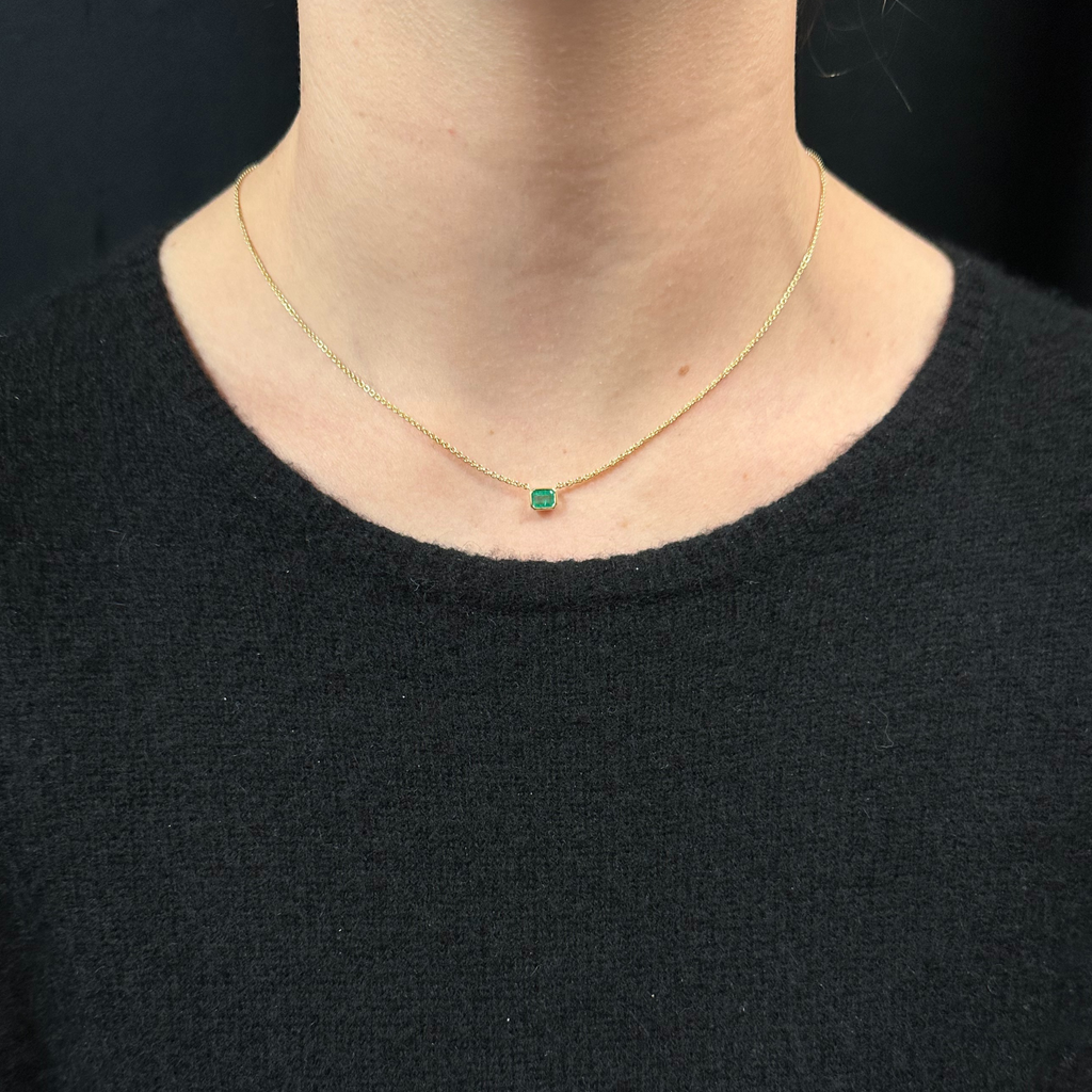 Petite and feminine, this stunning intense medium green emerald is beautifully bezel set in yellow gold and hangs delicately on an 18k yellow gold chain. This one-of-a-kind darling was designed for Daisy Exclusive by, Monica Savage and would look perfect alone or layered with favorites from your collection.