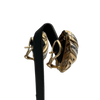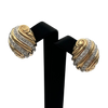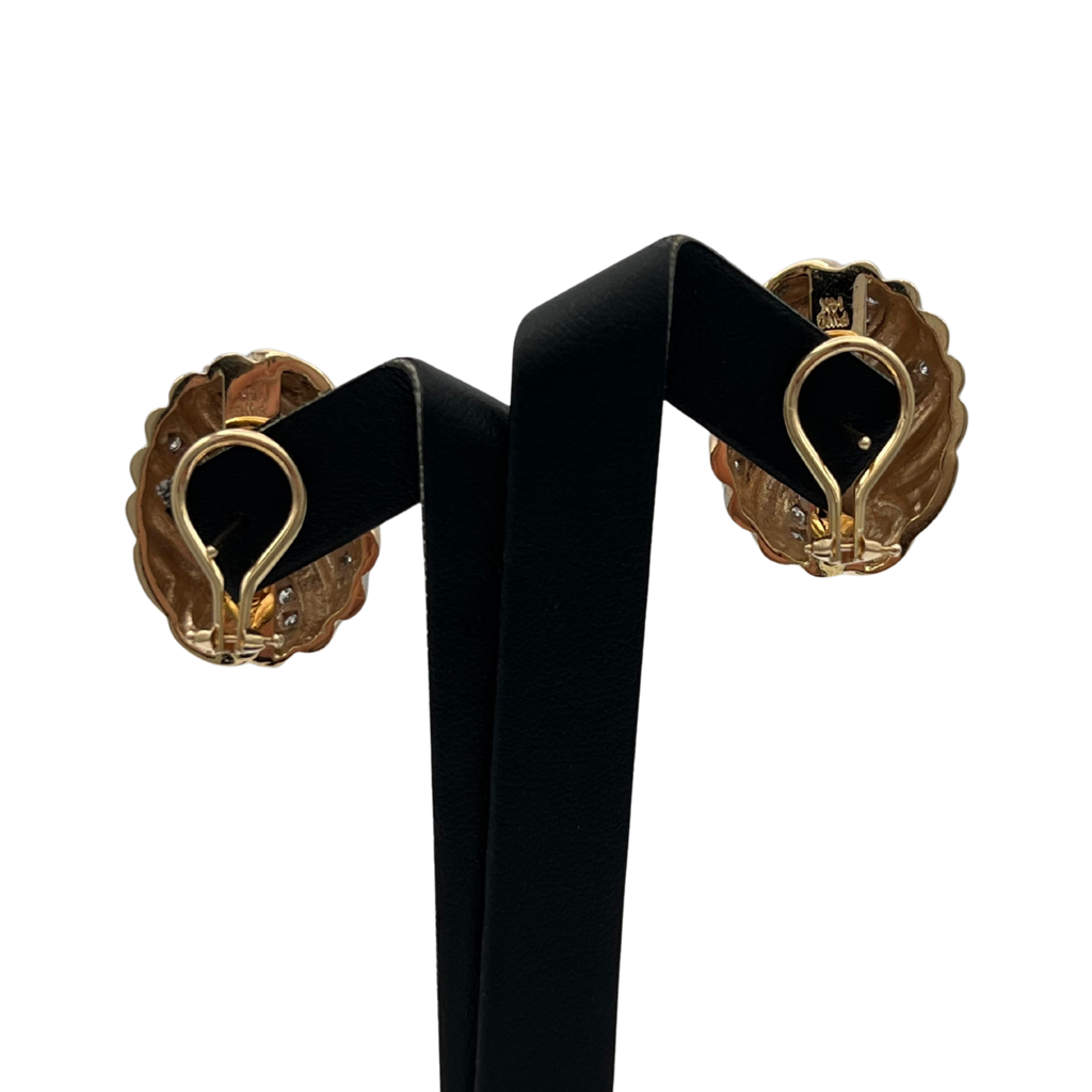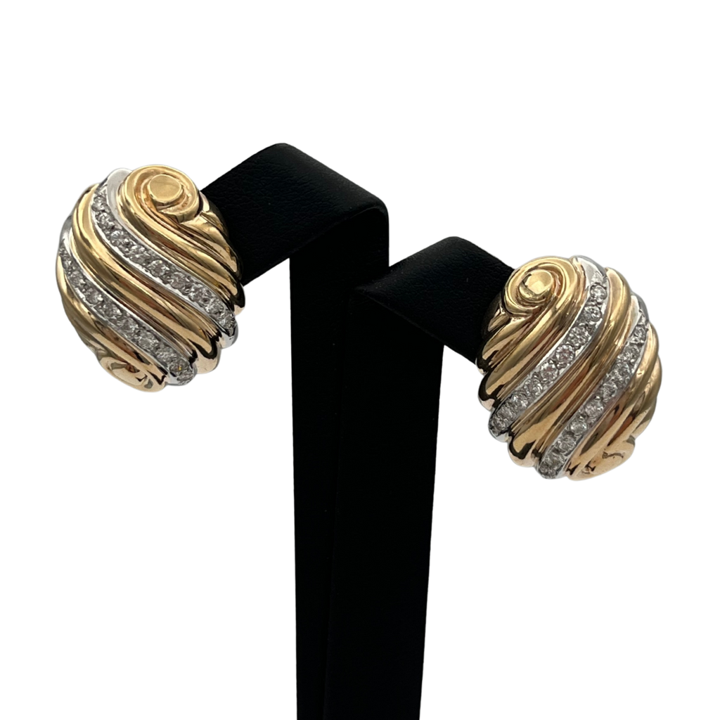 Vintage 14k yellow gold and pavé diamond dome earrings with an elegant ridged scroll motif. Earrings are worn with a post and omega clip mechanism.