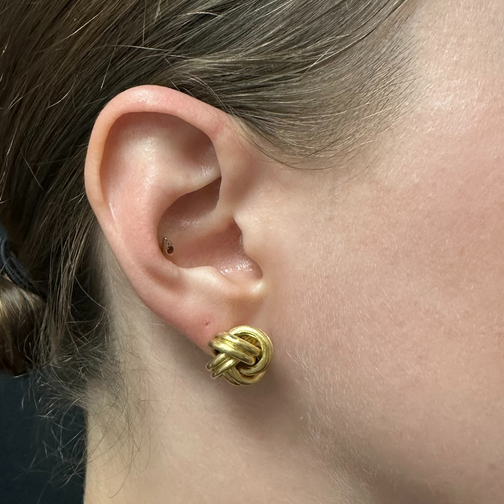 Vintage Italian 18k yellow gold knot style earrings featuring a stone finish.