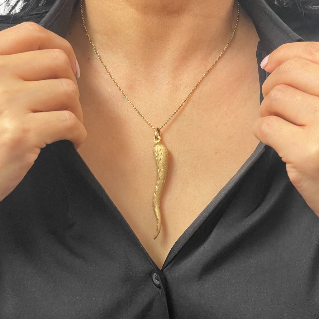 10k yellow gold hollow horn charm/pendant with engravings. Strong symbolism as a powerful amulet or talisman, this Cornicelo brings protection from the evil eye and misfortune to its wearer.