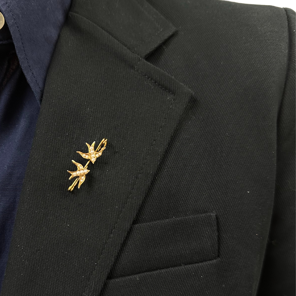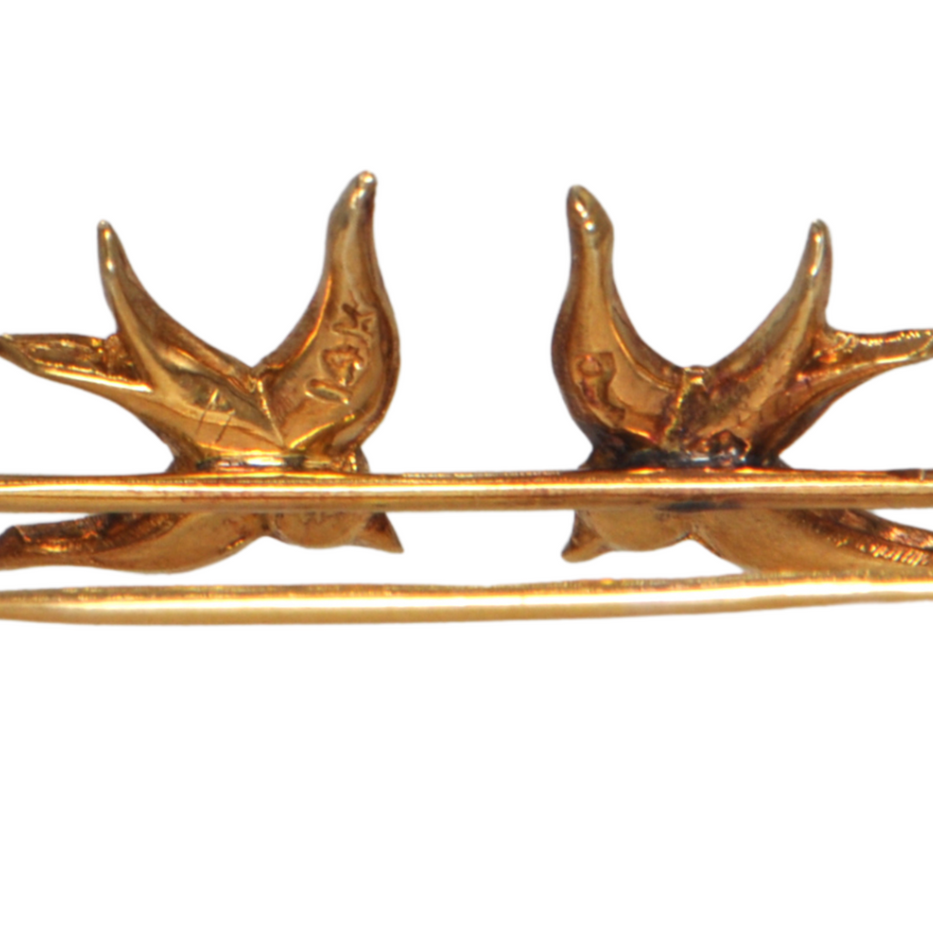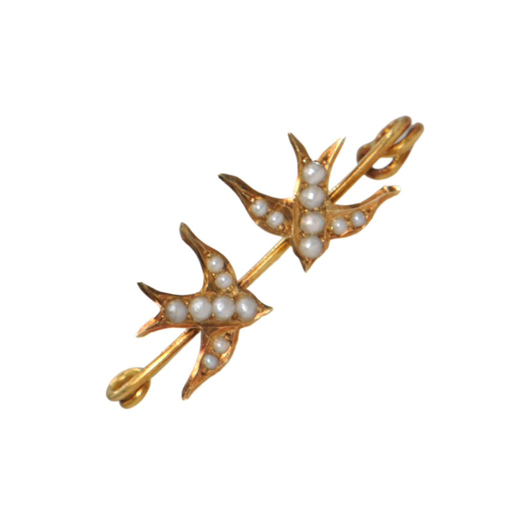 Delightful Victorian 14k yellow gold and seed pearl swallows bar brooch.