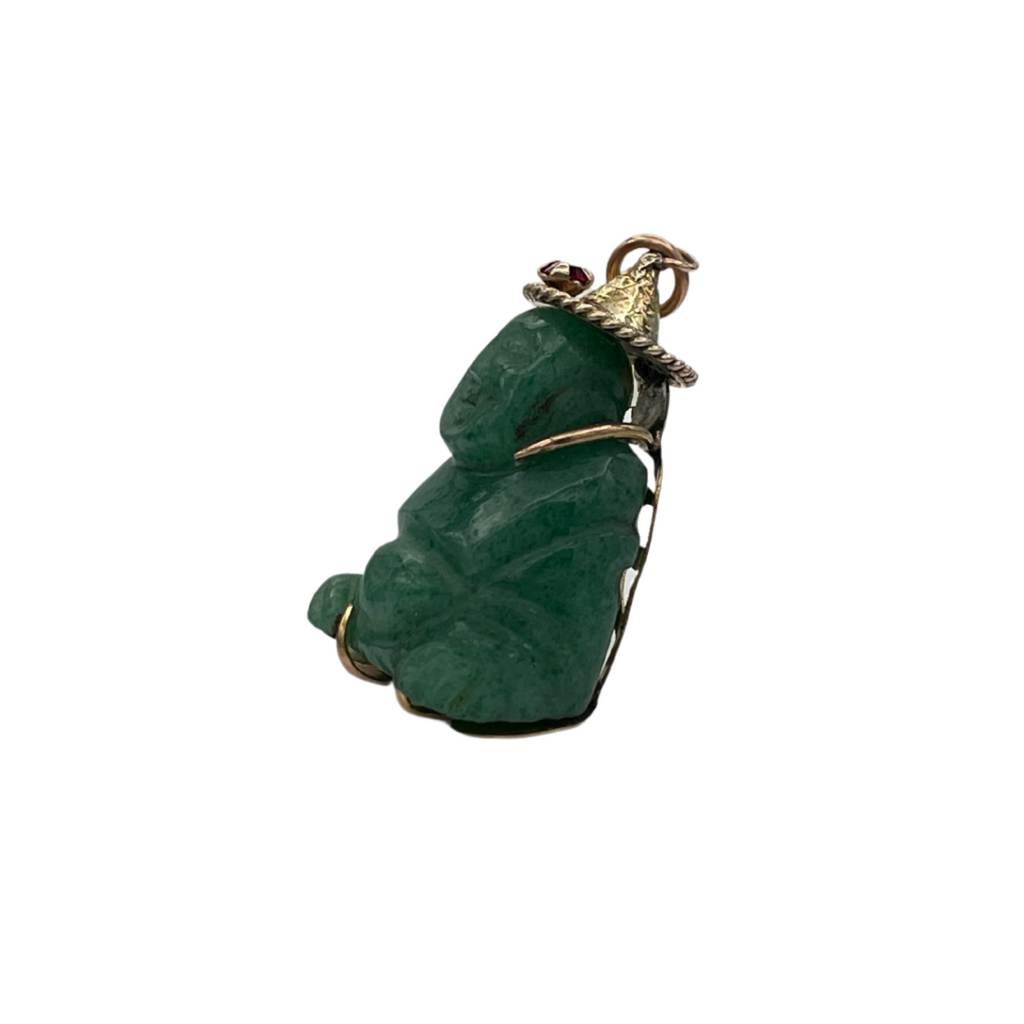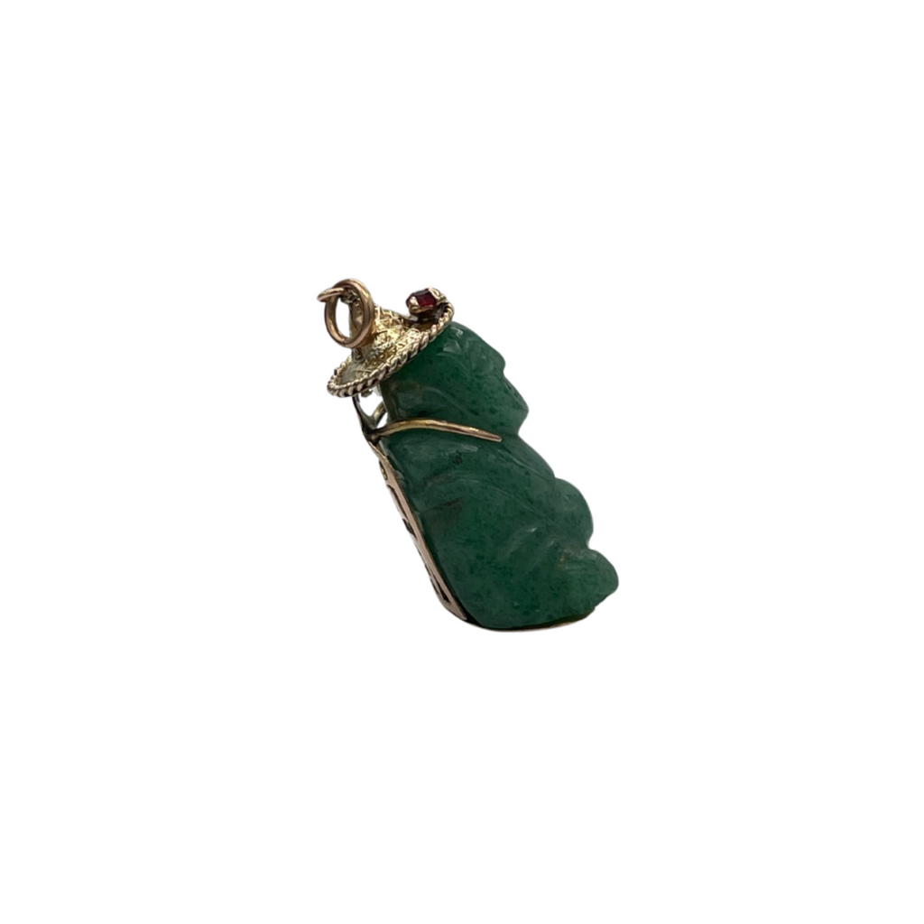 Genuine Vintage Carved Aventurine Quartz Buddha charm/pendant encased in 14k yellow/rose gold, with little decorative red glass stone on hat.