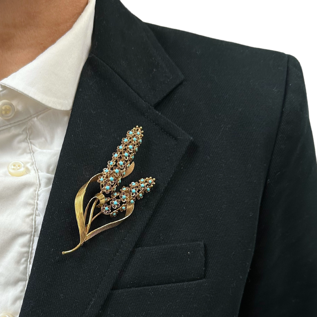 Exceptionally made retro 14k yellow gold bulrush brooch adorned with with perfectly matched Italian turquoise set in darling rosettes.