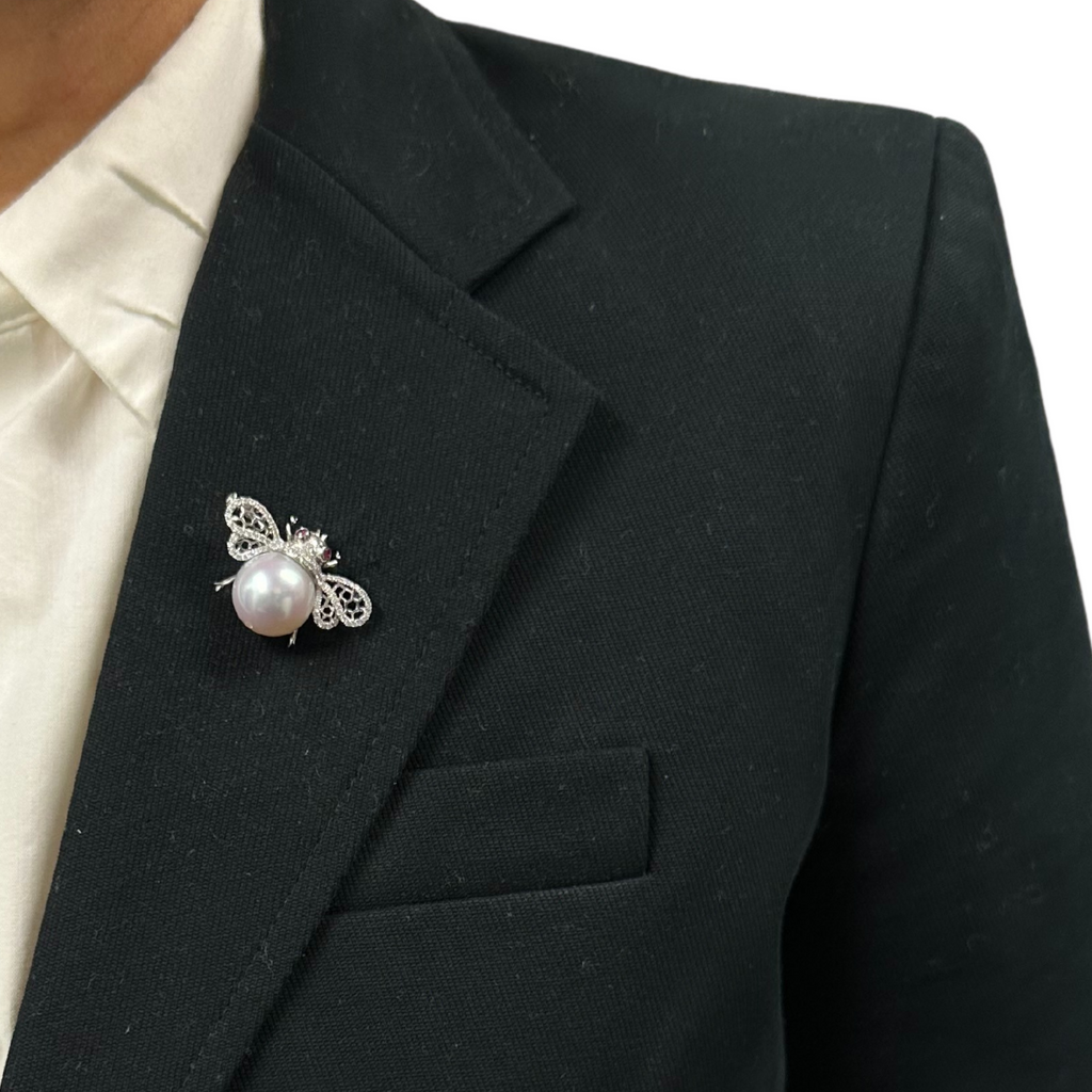 This adorable bumble bee brooch is made in 18k white gold with a lovely white lustrous South Sea pearl and with ruby and diamond accents.