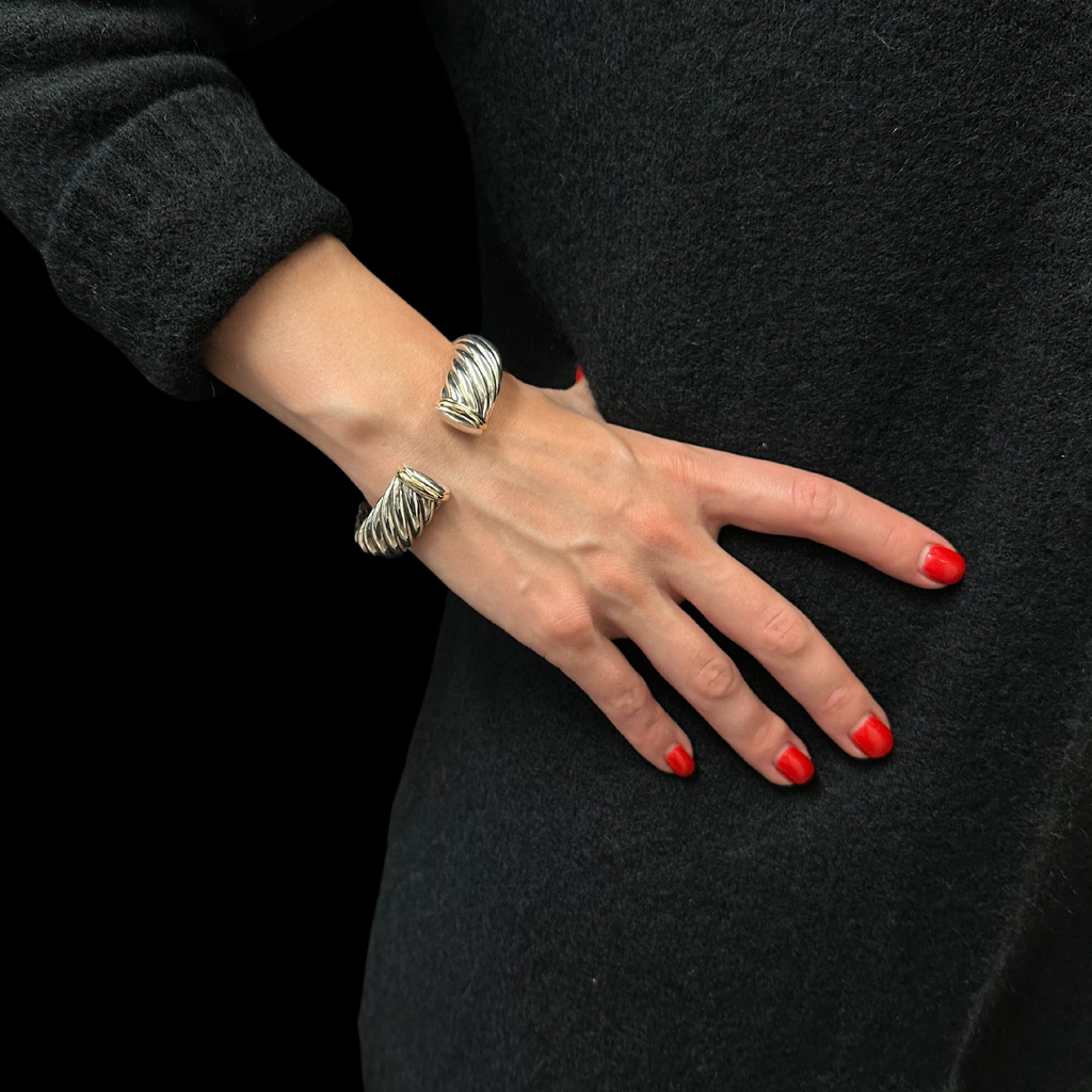 "In Sculpted Cable, David Yurman transforms his signature design motif into a carved form. The effect is an entrancing wavelike pattern that retains the dimensional look of Cable’s original helix." - David Yurman Website