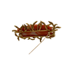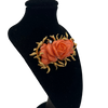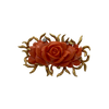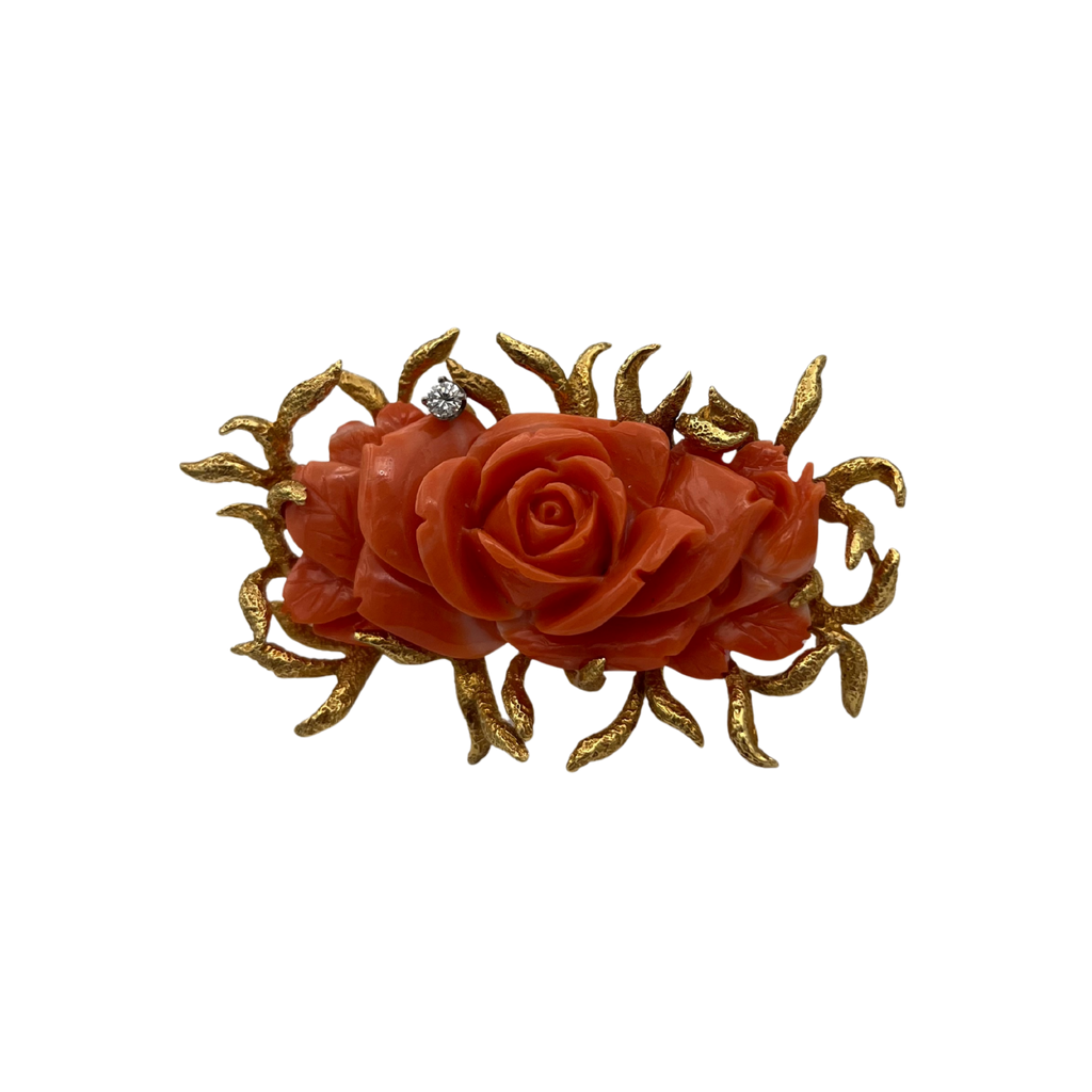 An extraordinary mid century piece. This brooch's beautiful coral centerpiece is masterfully carved and set into an 18k gold setting made to resemble the roses thorns.