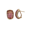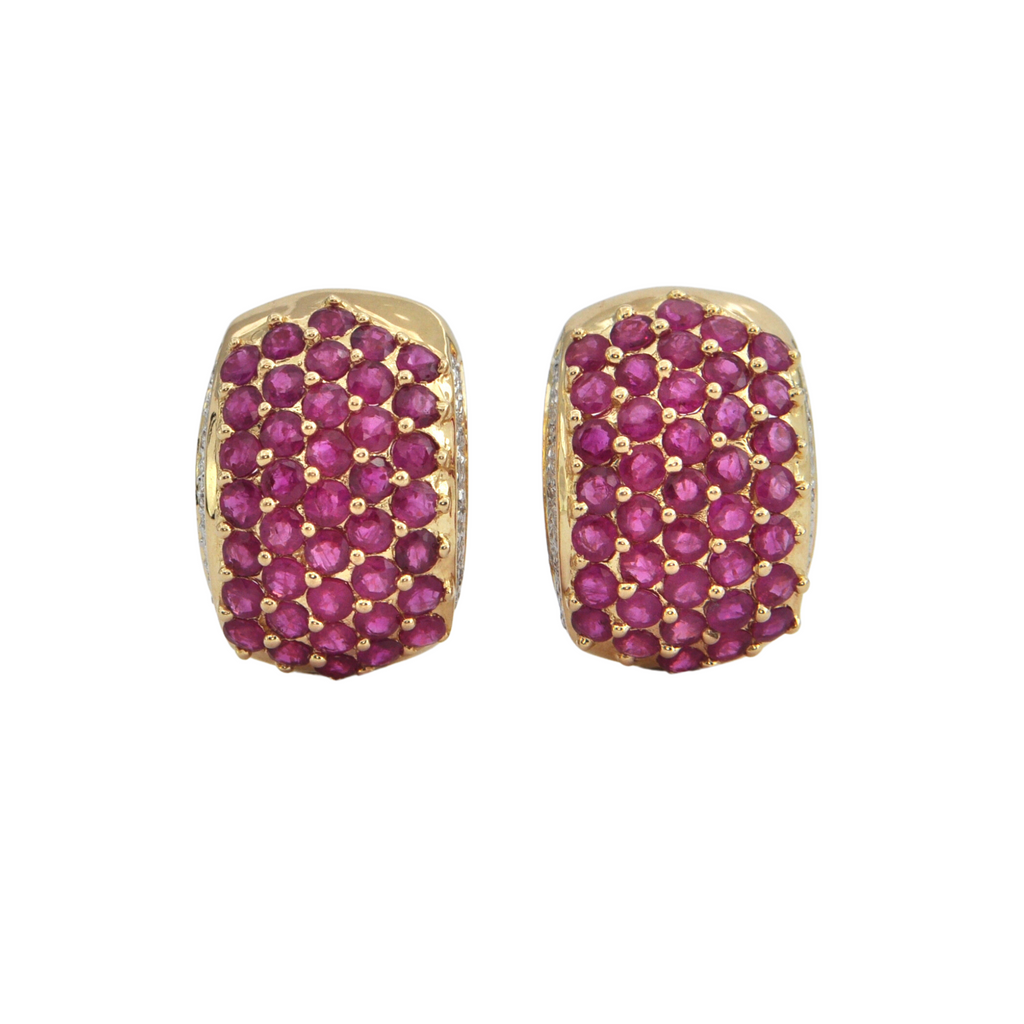 Concentric rows of sparkling candy pink sapphires are beautifully pavé set in 14k yellow gold. The sides of these shrimp style earrings are lined with pre-set diamonds to add a little je ne sais quoi to this fab pair.
