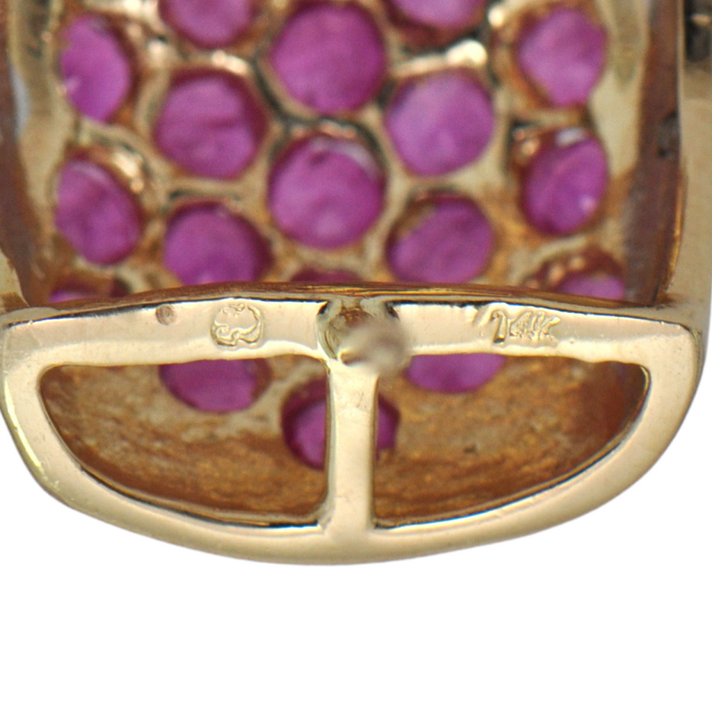 Rubies: Seventy-two (72) pavé set, round faceted rubies measuring approximately from 2.4 to 2.6mm each in diameter. Estimated ruby weight is 0.80 ct.