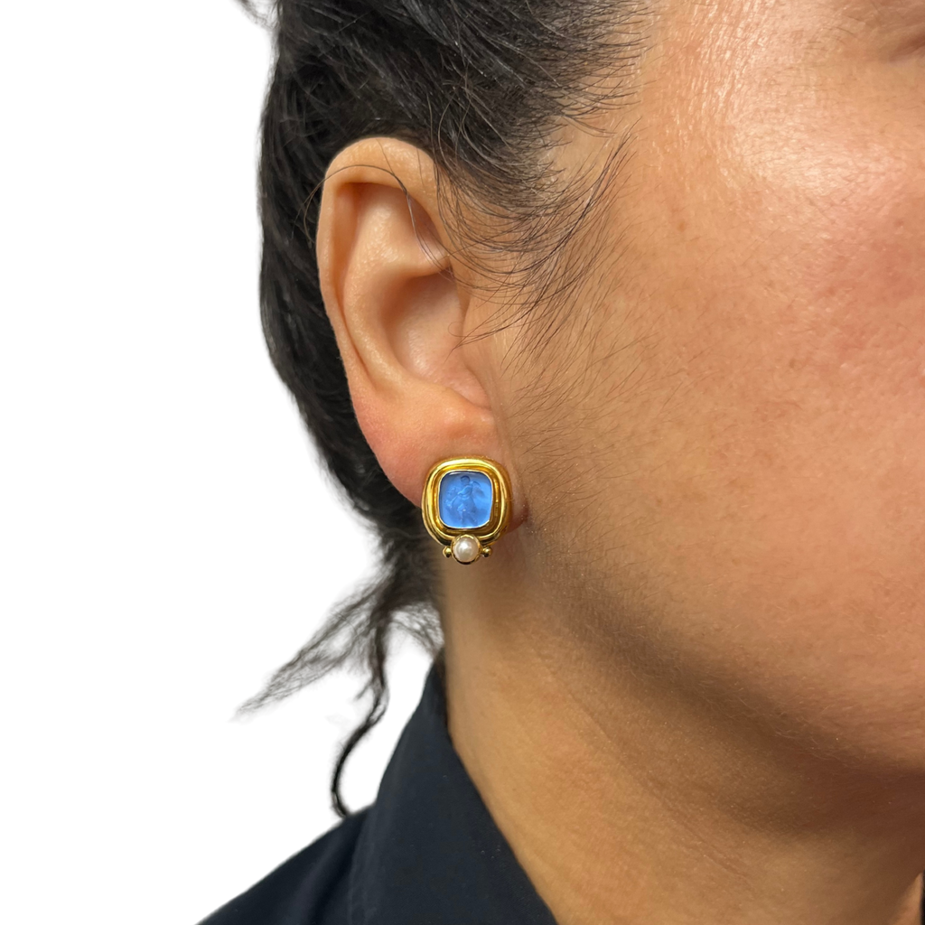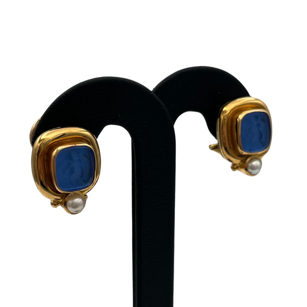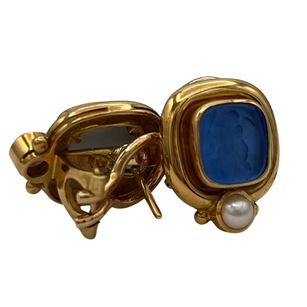 Estate signed Elizabeth Locke "Square Putto" style intaglio earrings in 18k yellow gold earrings. These earrings feature an omega back and fold-down post which allow them to be worn as clip-ons as well.
