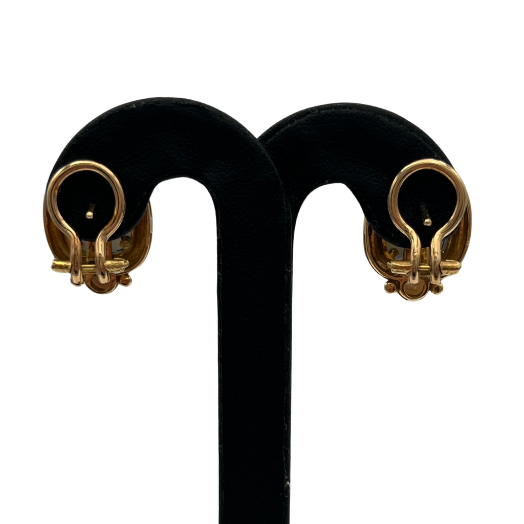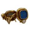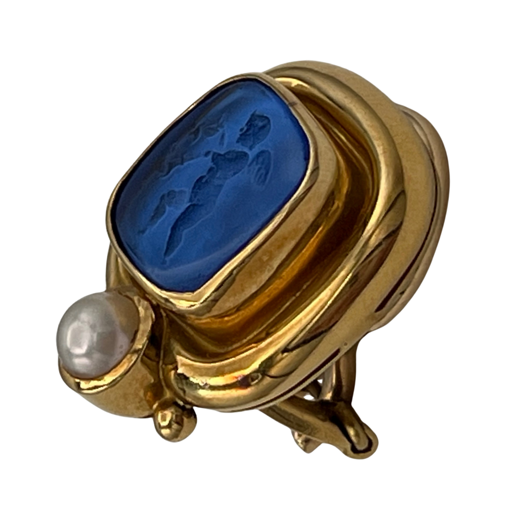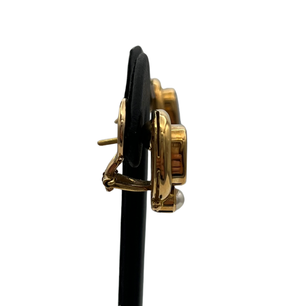 Estate signed Elizabeth Locke "Square Putto" style intaglio earrings in 18k yellow gold earrings. These earrings feature an omega back and fold-down post which allow them to be worn as clip-ons as well.