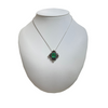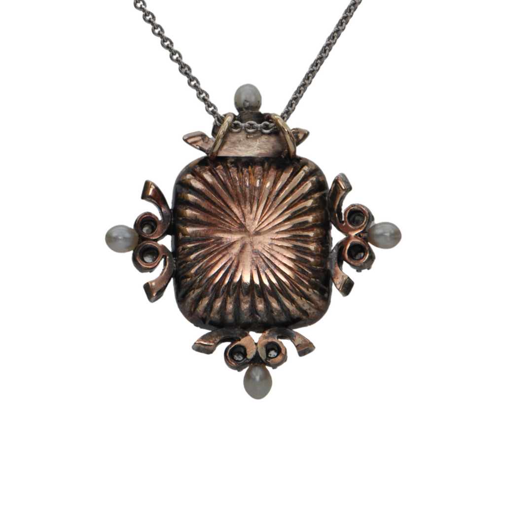 The emerald is surrounded by a halo of rose cut diamonds, and the frame is decorated with a lovely bow motif on each side adorned with diamonds and a single tear shaped pearl. Back of this pendant features a fluted design motif.