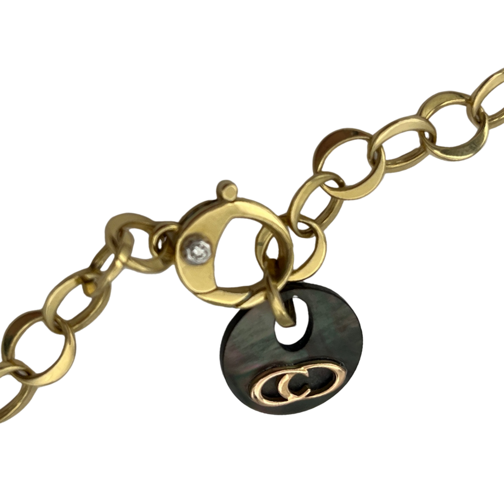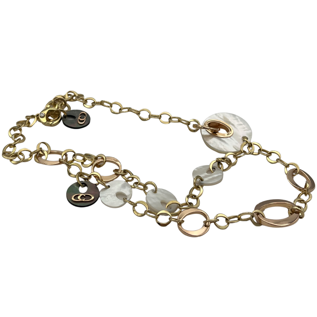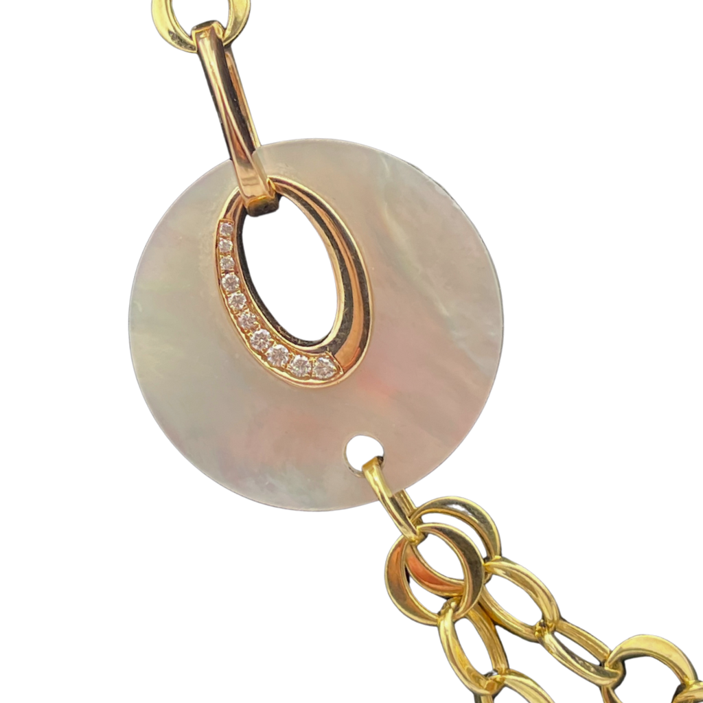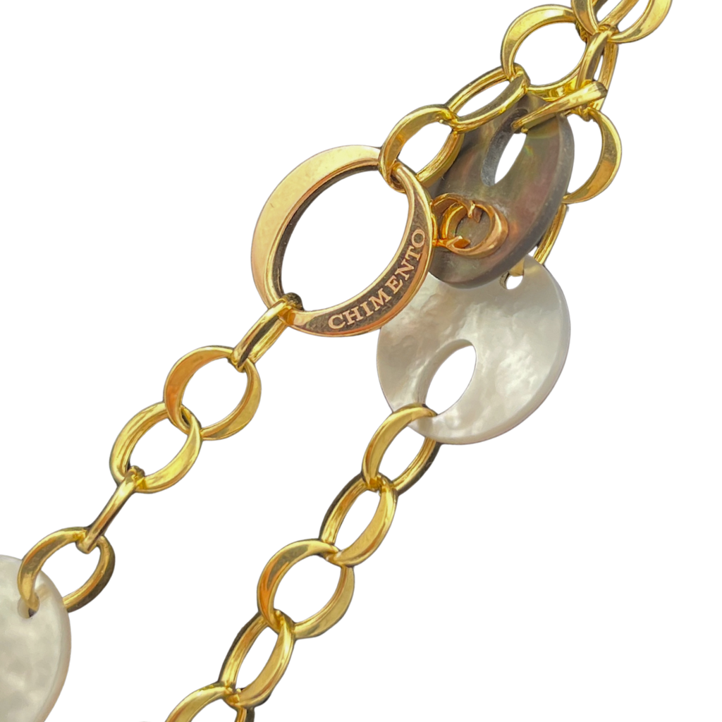 Family owned, the Italian brand Chimento has been creating fine quality and uniquely designed jewellery since 1964. This necklace features 18k yellow and rose gold multi-strand chain, mother of pearl discs, and diamonds.