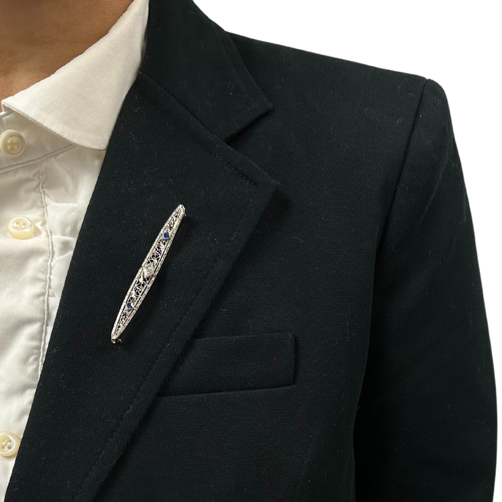 Delightful late Edwardian 14k white and yellow gold diamond and sapphire bar pin. Pin features a stunning gallery setting with a foliate open-work motif as well as millegrain and filigree work throughout.