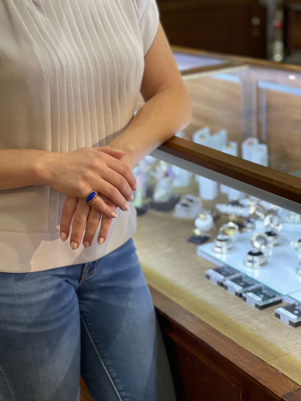 Stones: Lapis lazuli lozenge-shaped cabochon cut, quality; AAA
