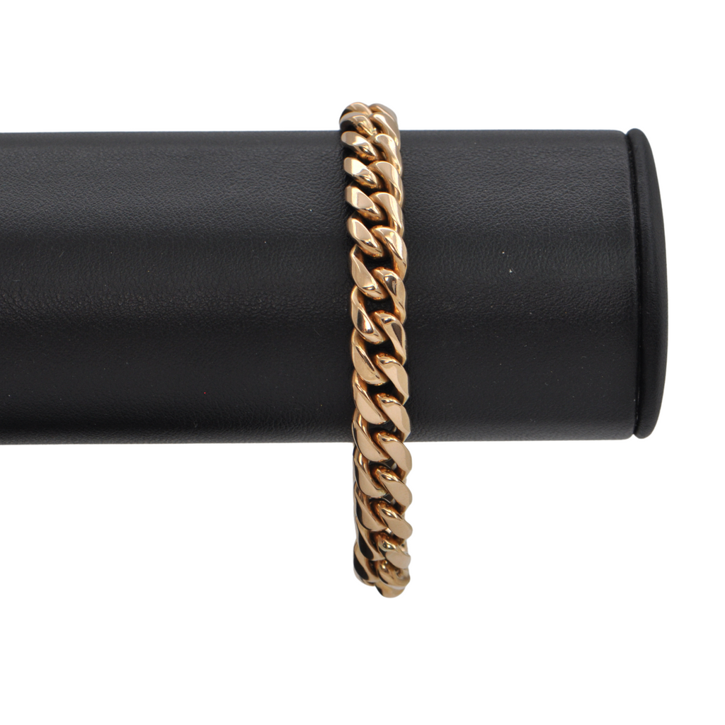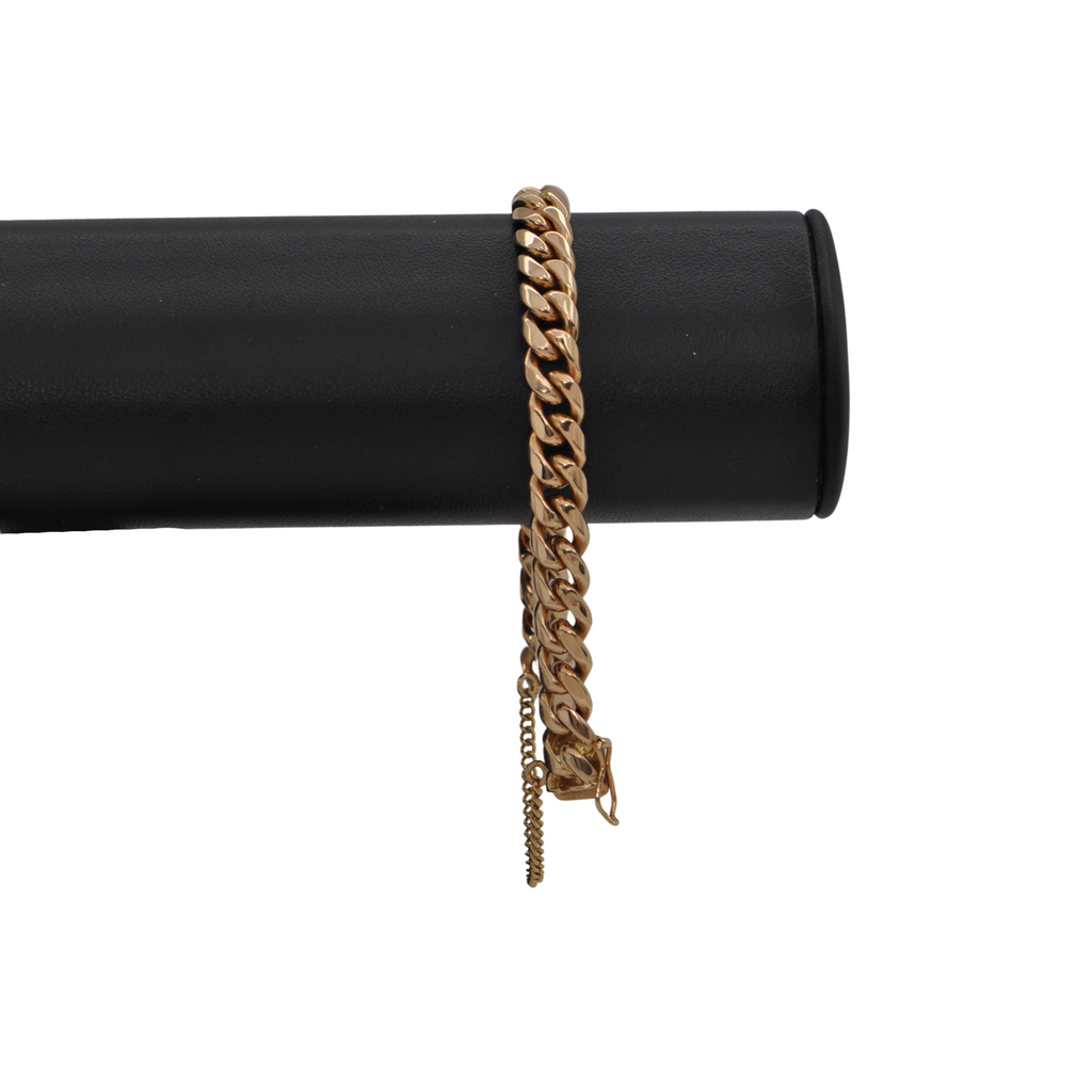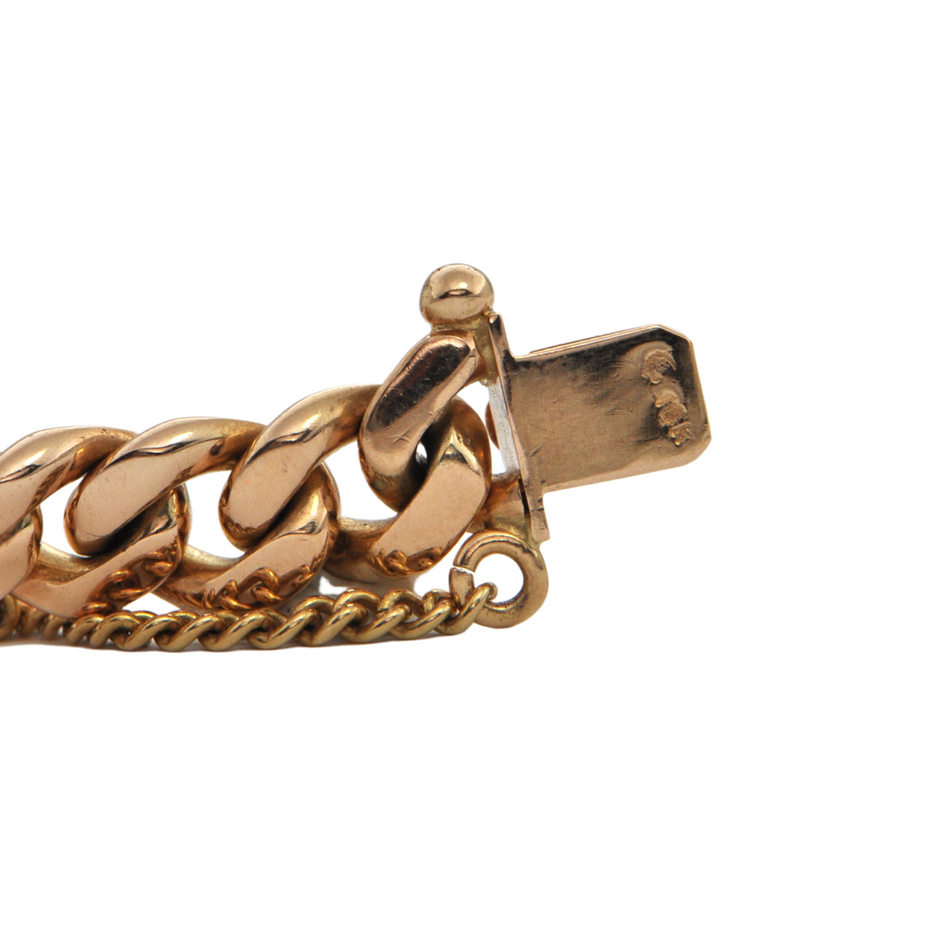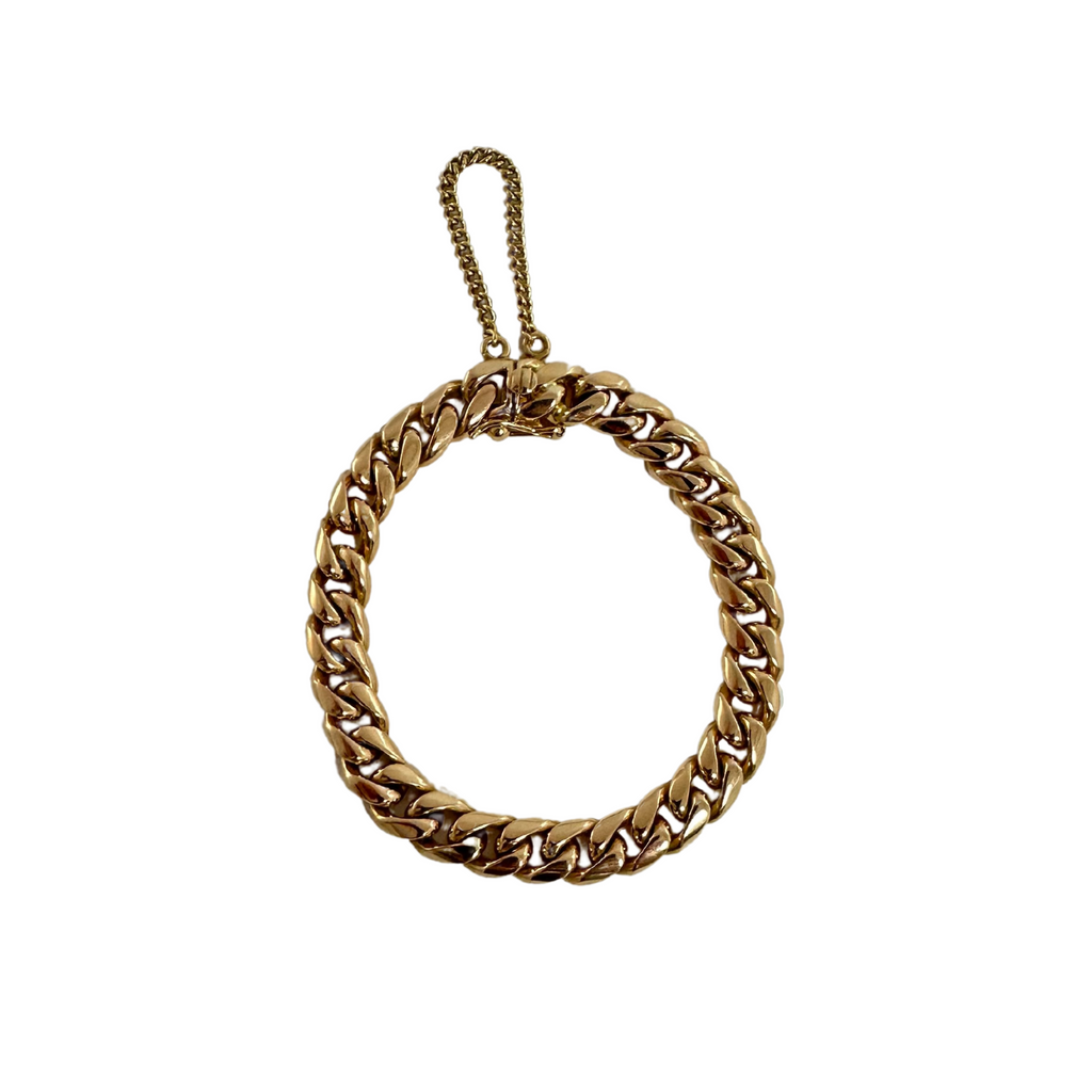 One can never go wrong with a classic curb link bracelet. Whether worn alone or used to display your collection of charms this solid 18k rose gold bracelet would be a fabulous addition to any collection. Attaches with a push clasp and has one figure eight safety lock and a 2 1/2 inch safety chain.