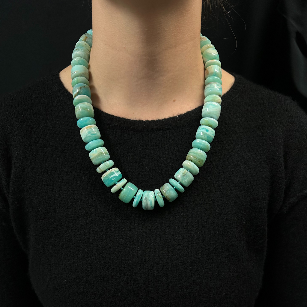 Peruvian opal rondelle bead necklace with sterling silver clasp.