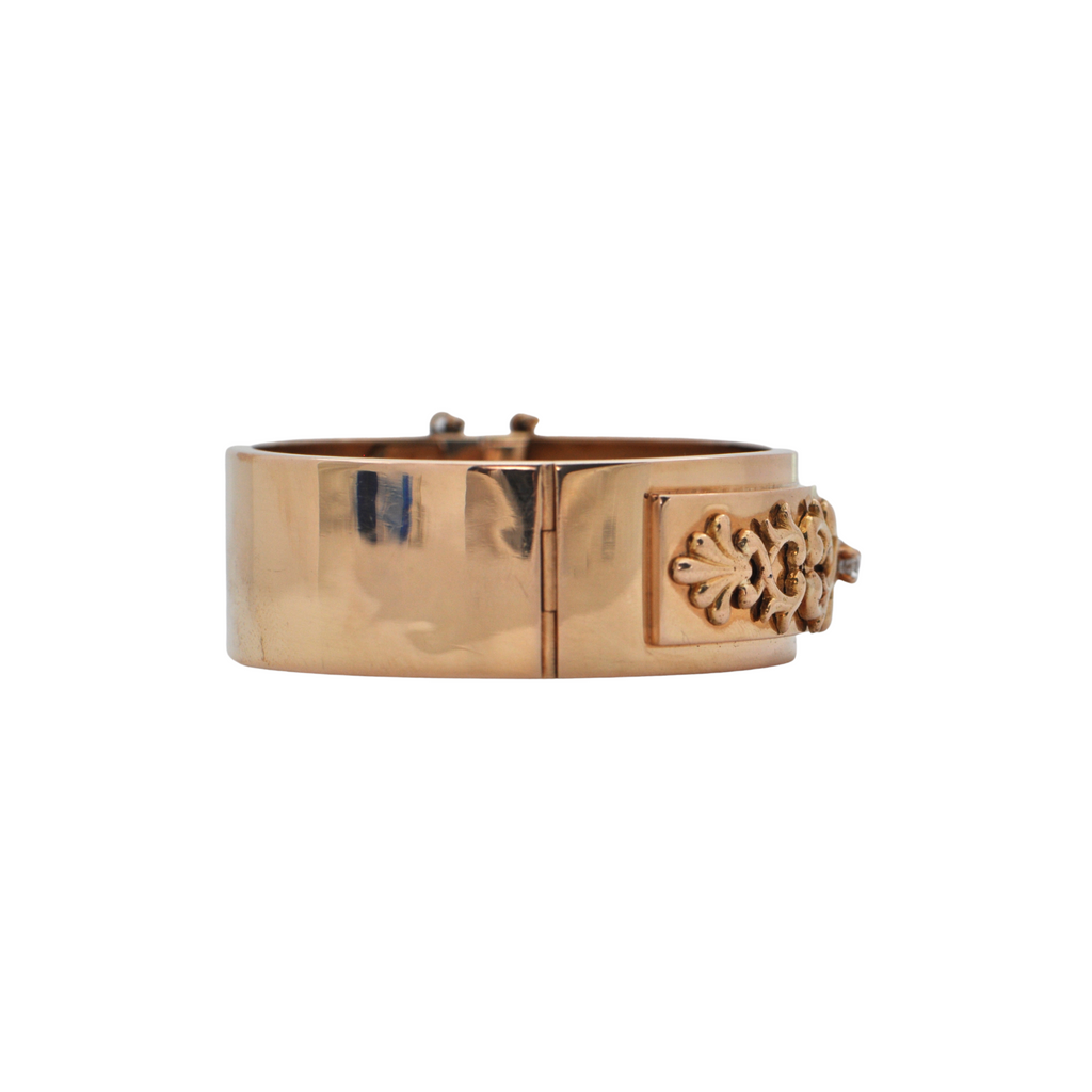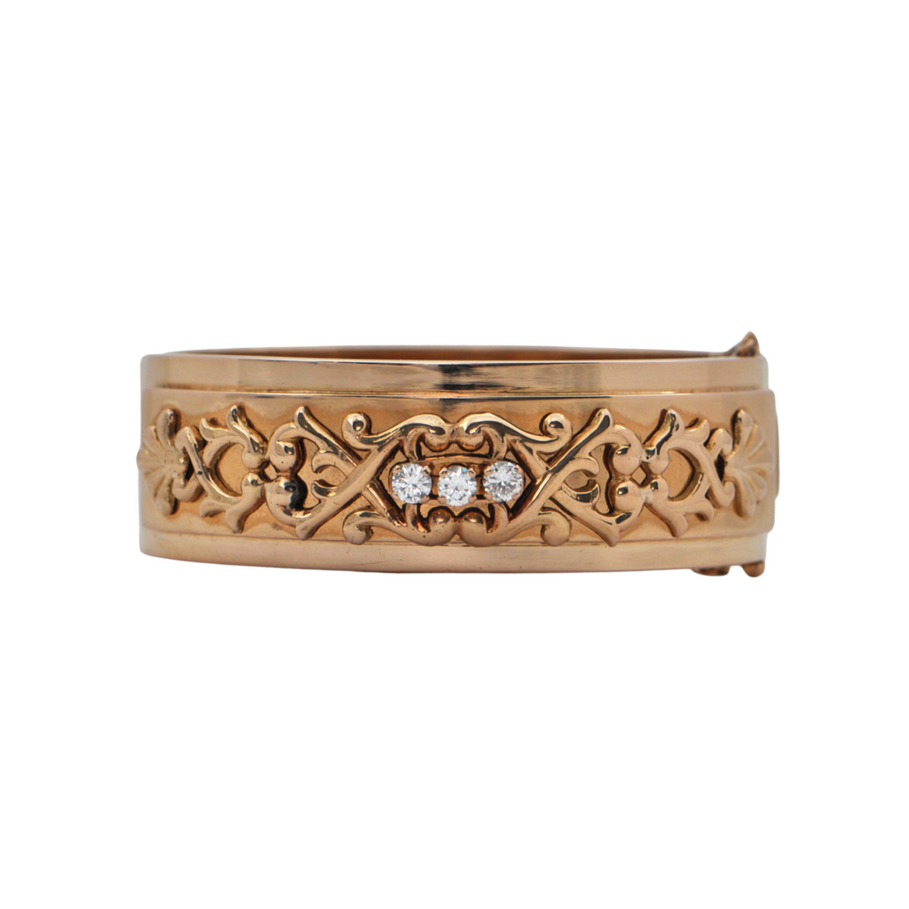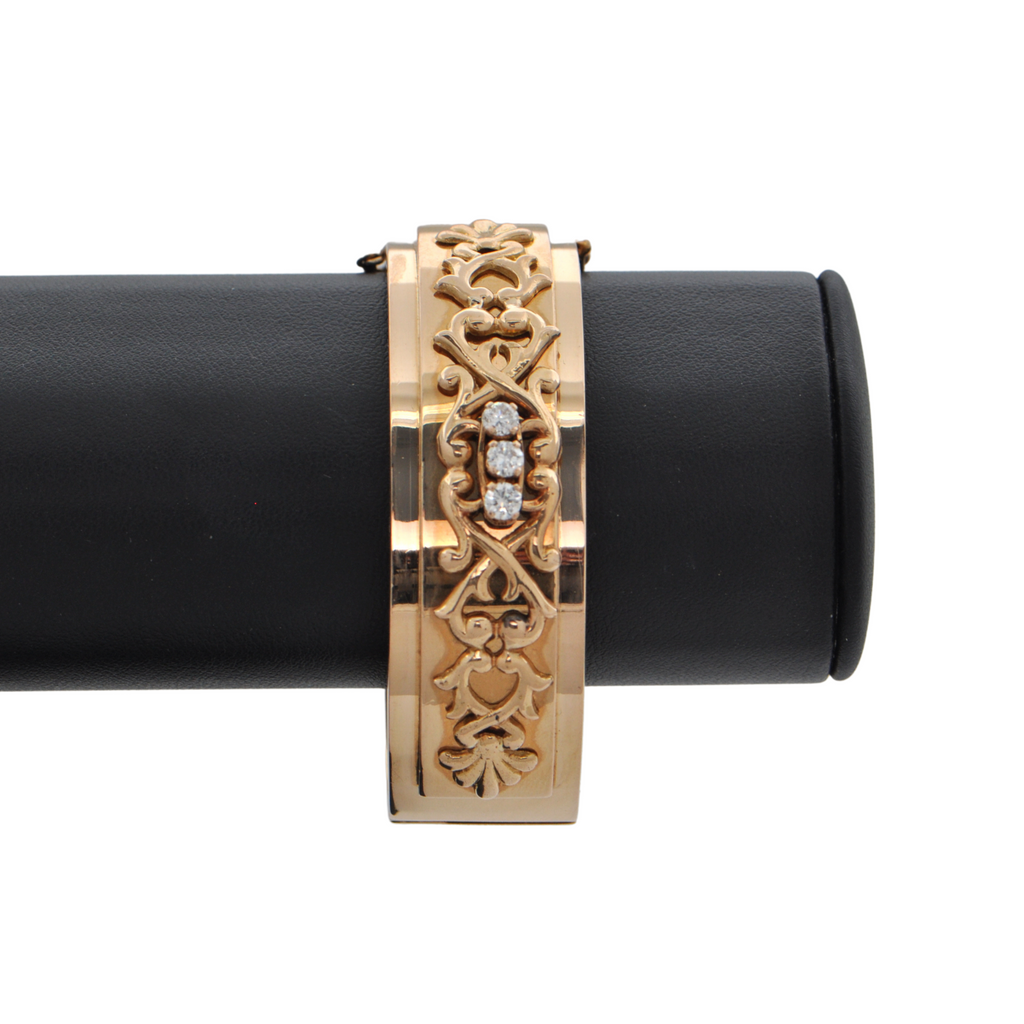 Fabulous retro French rose gold hinged cuff adorned with the sparkling round brilliant cut diamonds. Front of the cuff features scroll work en relief. Bracelet attaches with push clasp and has both a safety chain and figure eight safety lock.