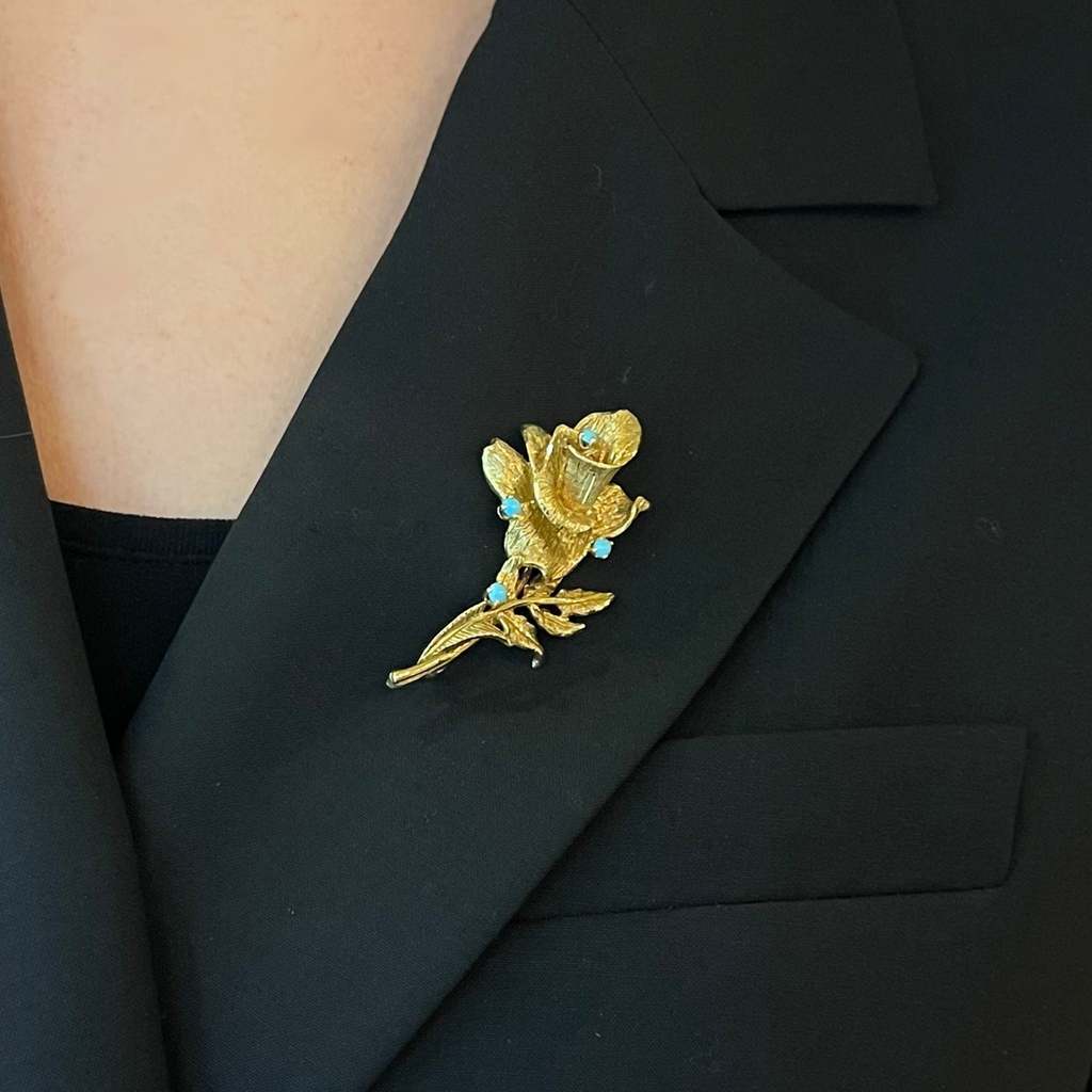 Elegant vintage flower brooch in 14k yellow gold adorned with turquoise stones.