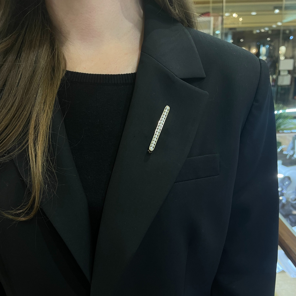 Elegant vintage solid 14k yellow gold bar pin brooch hand made and set with a row of lustrous round cultured pearls.