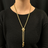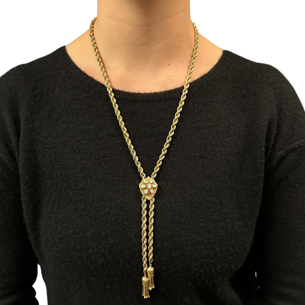 Exceptionally made 14k yellow gold slider necklace with crest slider decorated with opals that moves smoothly up and down the rope link chain. At the ends of this fabulous piece are a pair of dancing tassels.