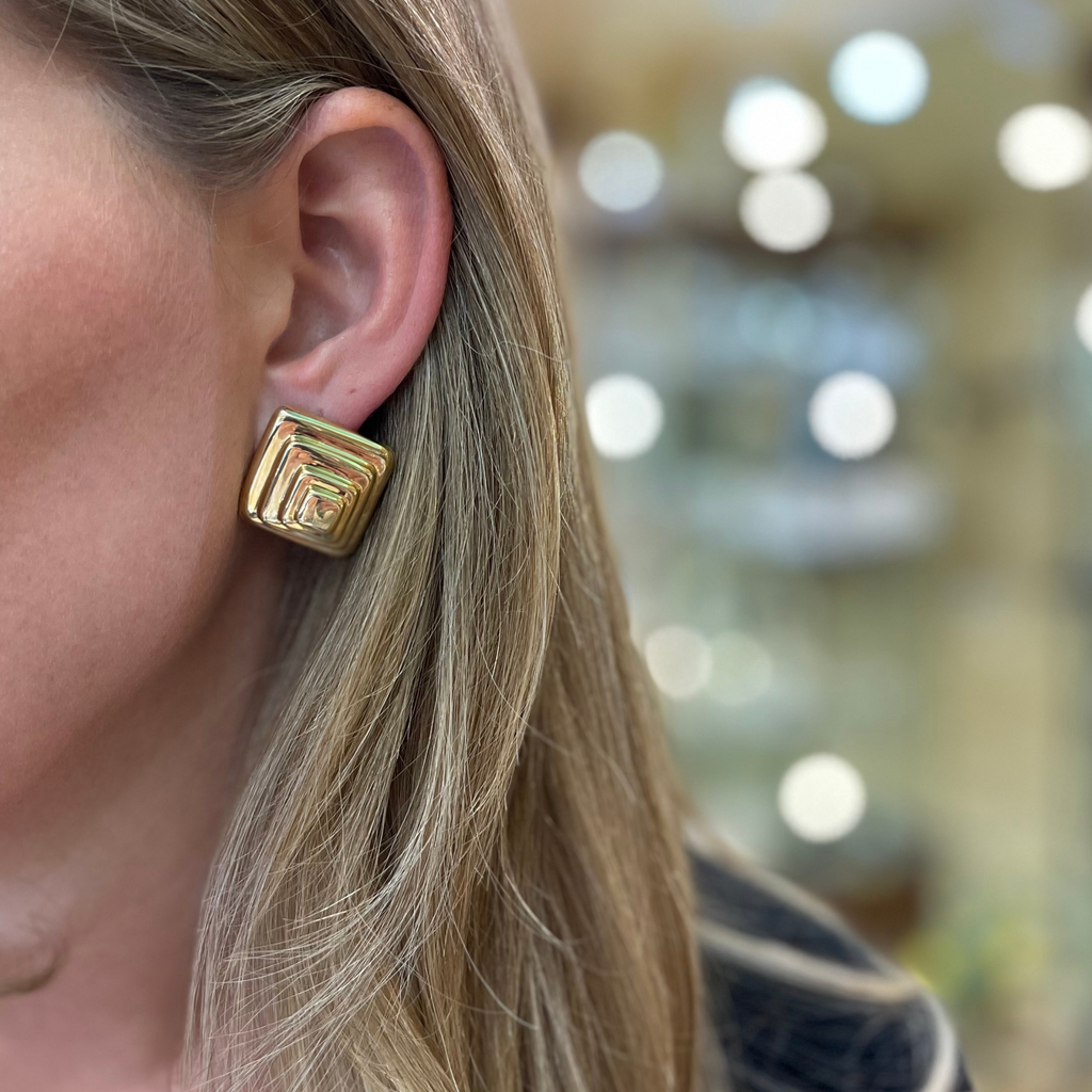 Lovely pair of classic vintage 14k yellow gold, square domed, off center pyramid shaped earrings. For the woman who loves the medium to large style earring- this does the trick- VERY FASHIONABLE- Attaches with quality strong thick omega back systems and posts.