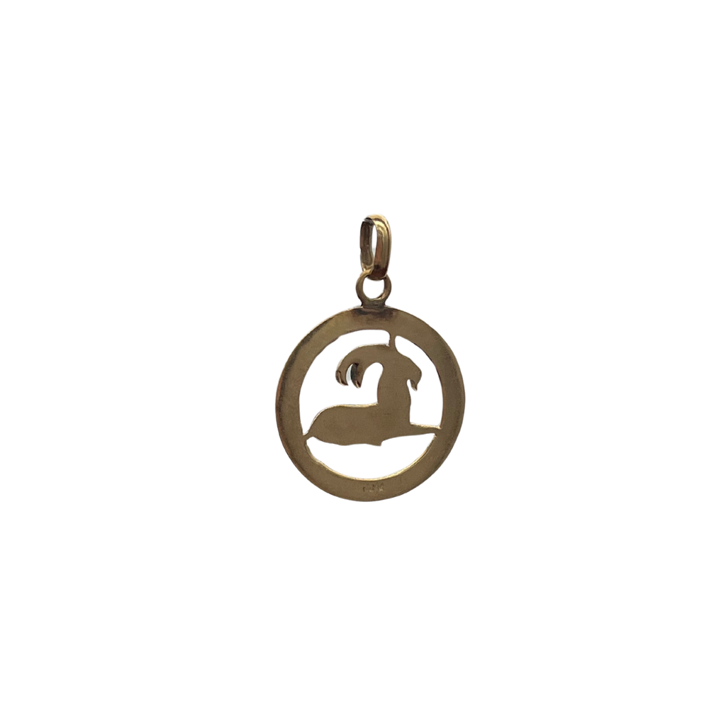 Vintage 14k yellow gold seated ram pendant in a decorated round frame.