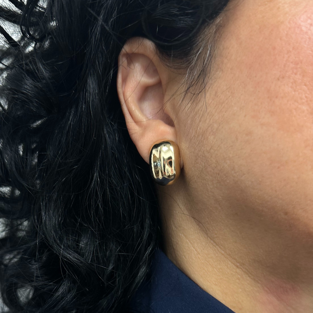 Classic pair of vintage 14k yellow gold oval, high domed earrings featuring a high polish finish. (note the heavy reflections with the high polish). Earrings attach with post and omega clip in both 14k yellow and white gold.
