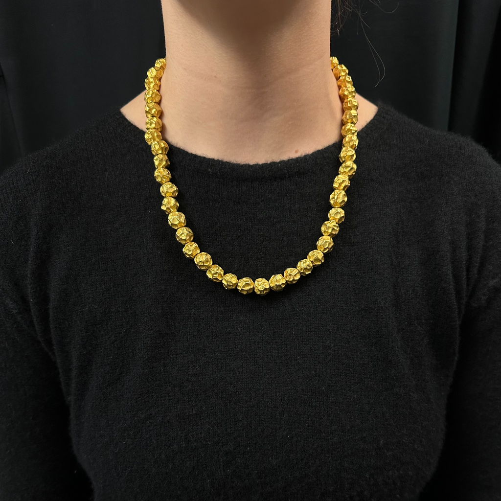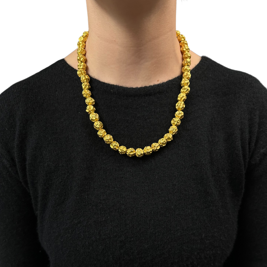 Fabulous bright 18k yellow gold rough ball bead necklace. This lovely necklace attaches with a hook and eye clasp decorated with gold ball beading.