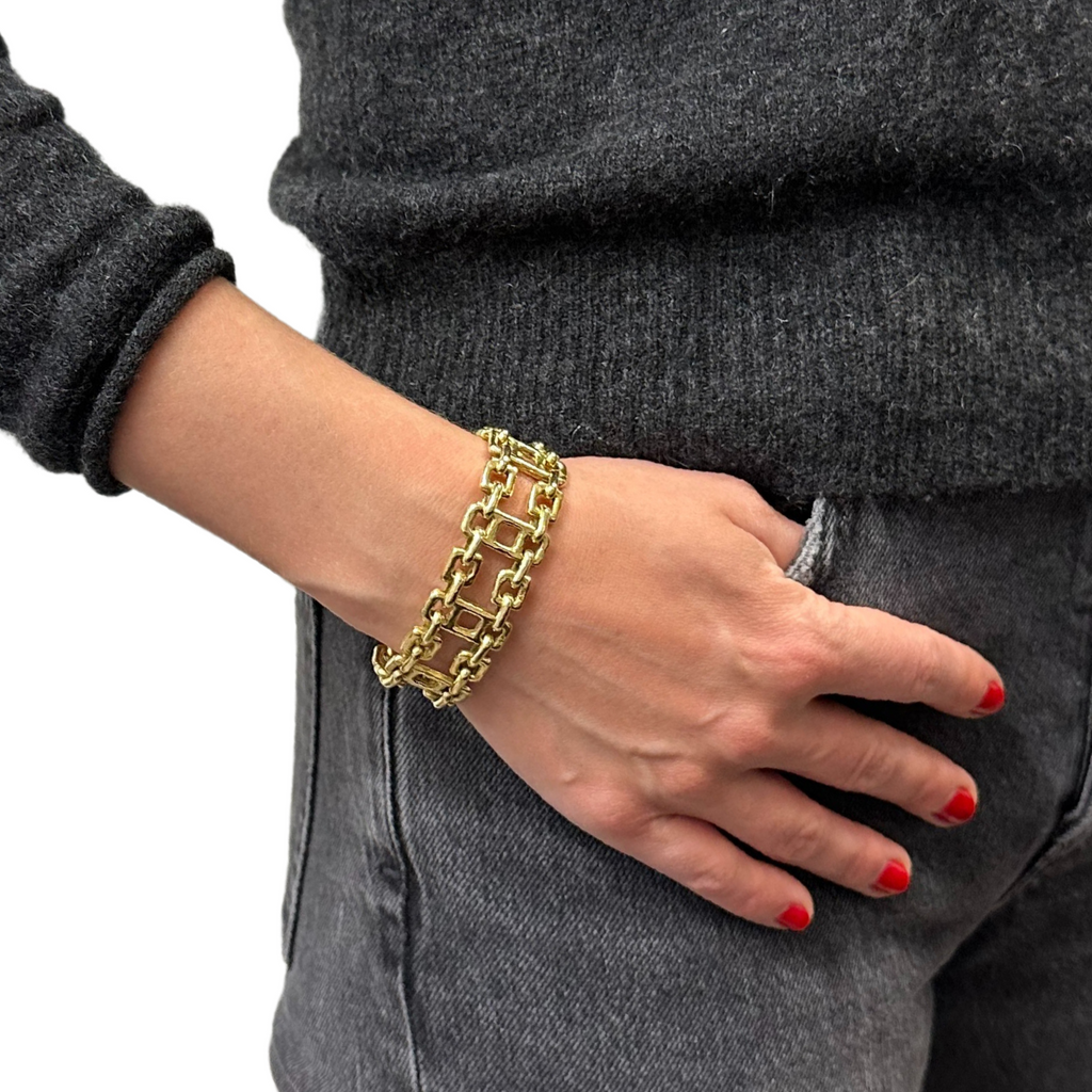 Elevate your jewelry game with our Mid-Century 18K Gold Rectangular Link Bracelet. Hand crafted from solid 18k gold, this bracelet features a unique, bold design inspired by the Brutalist style. Make a statement and add a touch of vintage charm to your look with this one-of-a-kind piece!