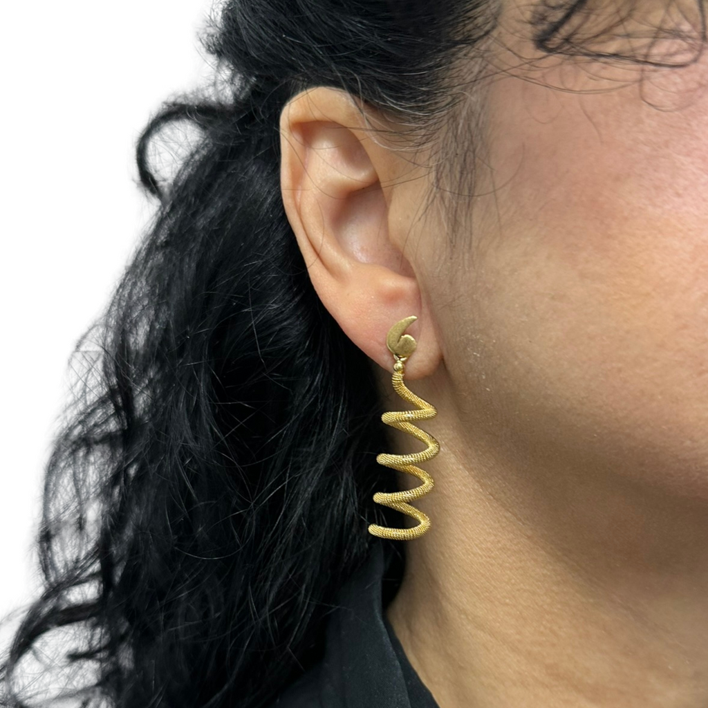 Whimsical pair of vintage serpent like coiled drop earrings featuring decorative twisted filigree work down the entire drop coil. Earrings attach with post and butterfly systems.