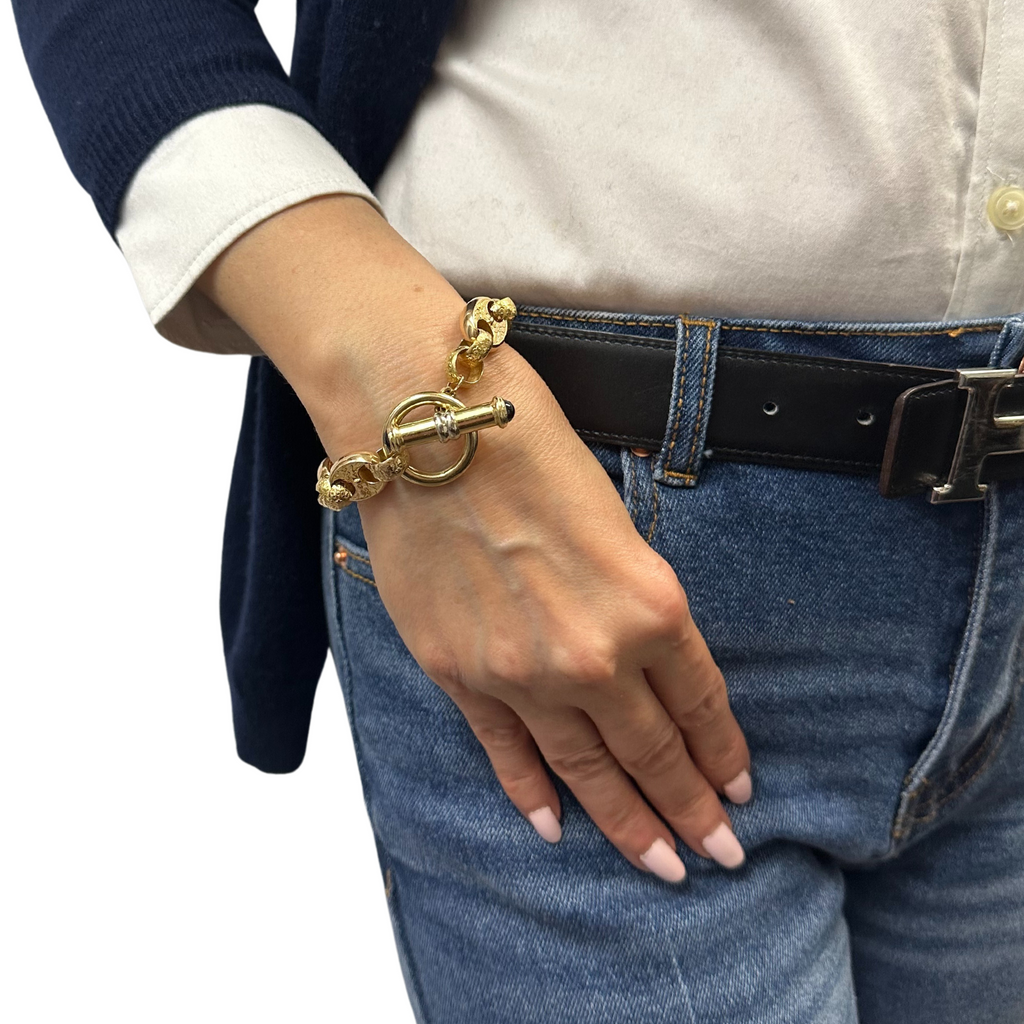 Not your average mariner link bracelet, each link on this 18k yellow and rose gold bracelet is ornamented with a floral and star design. This whimsical bracelet attaches with an oversized toggle and ring clasp.