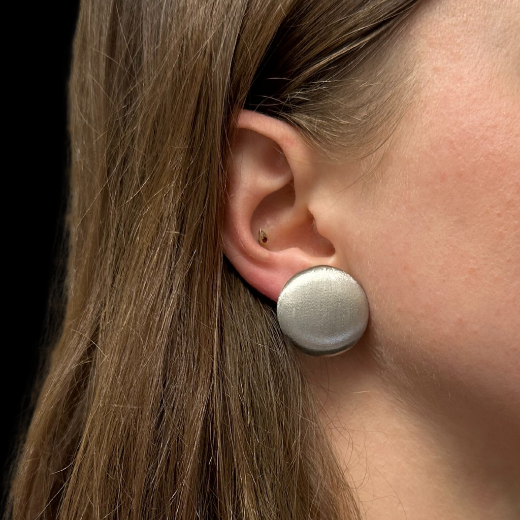Lovely vintage 18k white gold round clip-on earrings featuring a brushed finish. Post can be added.