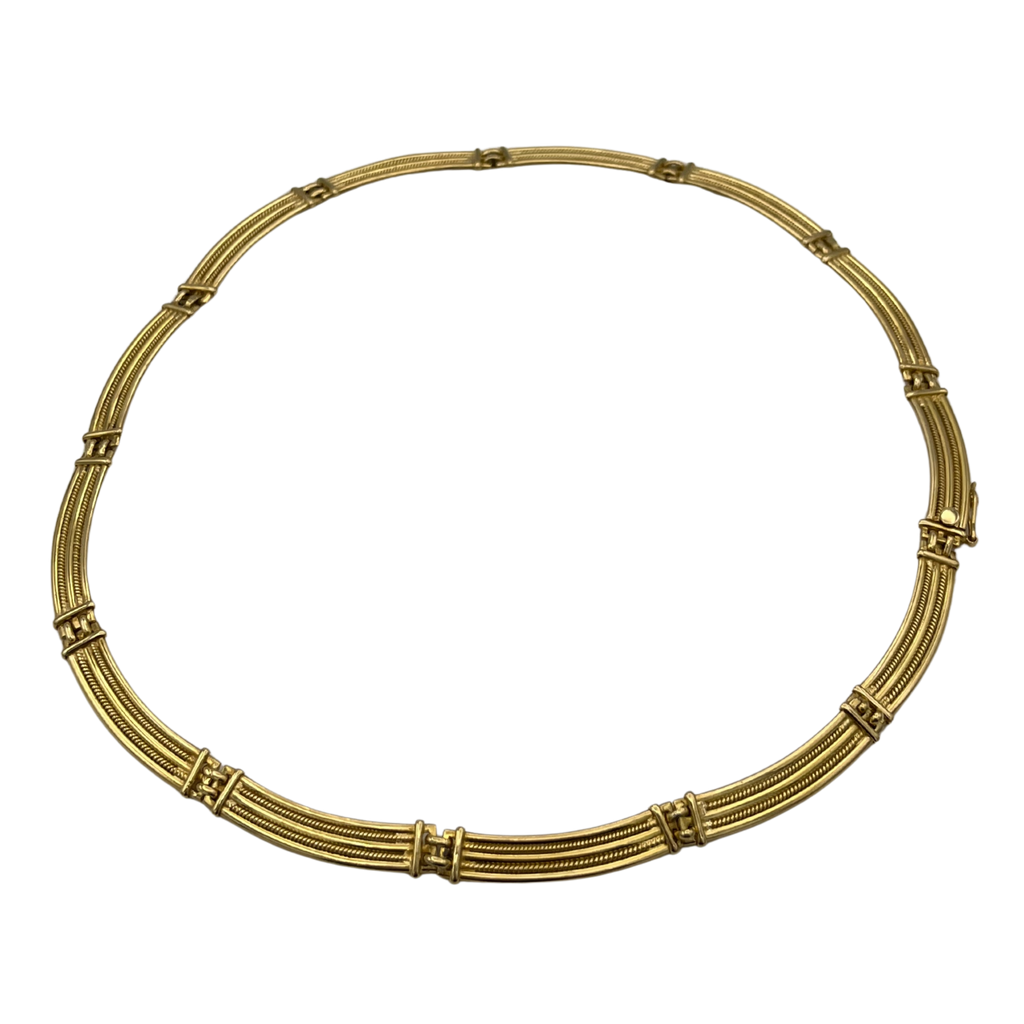 Vintage decorated curved bar link necklace in 18k yellow gold with a push clasp and figure eight safety lock.
