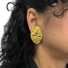 Fabulous and elegant pair of bright yellow 18k gold earrings adorned with a bezel set cabochon cut round ruby. Earrings feature a scroll like motif en relief with a hammered style background. Posts can be easily added upon request. No extra charge.