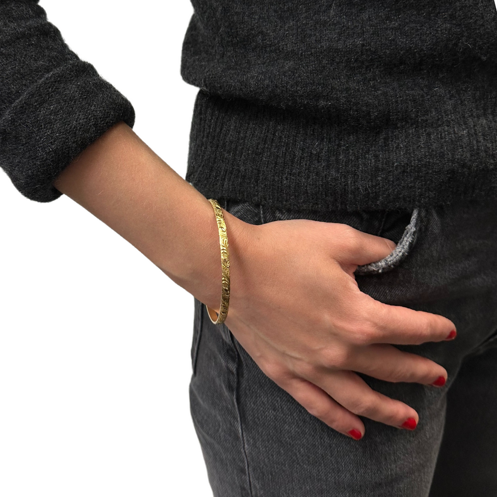 Elegant vintage 18K yellow gold bangle bracelet with leaf motif en relief. Two in stock, perfect for layering.